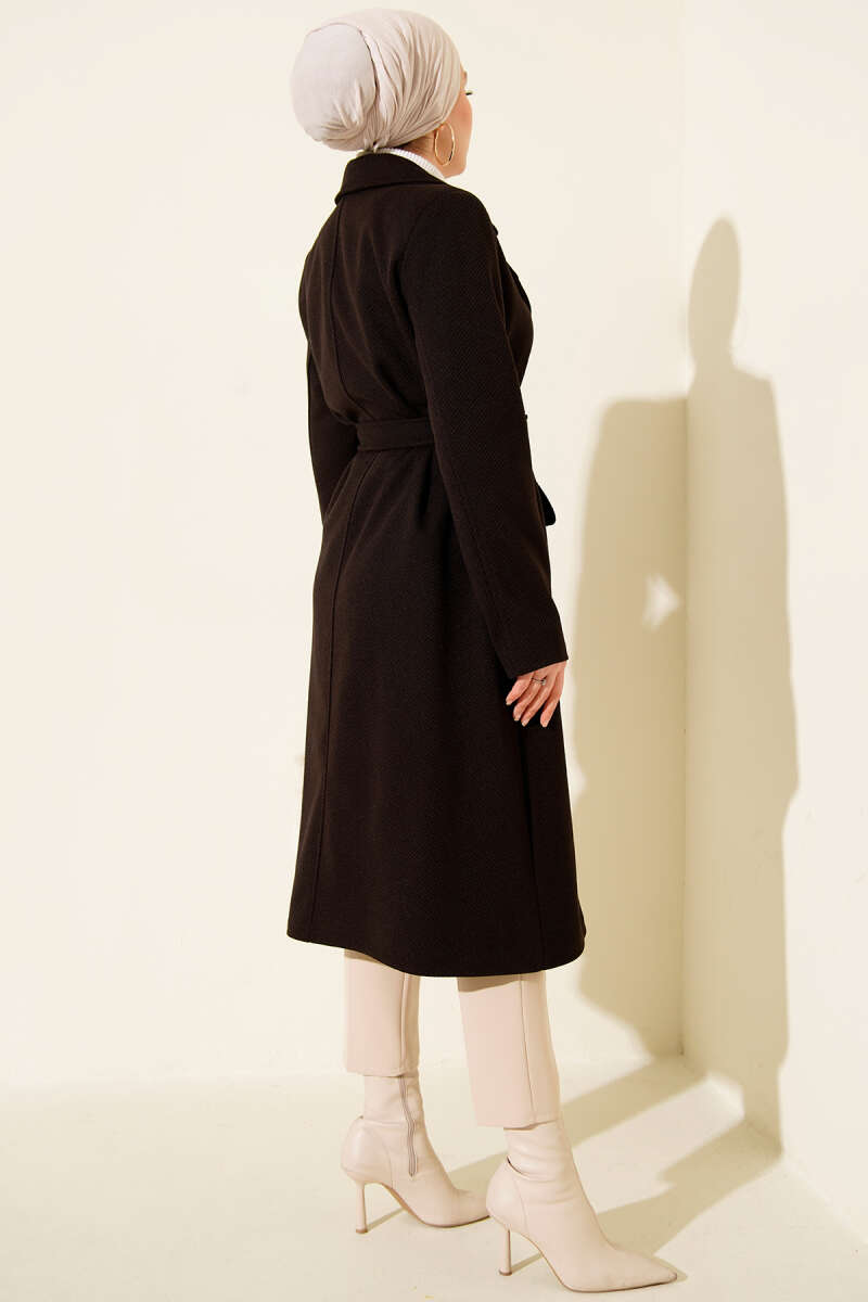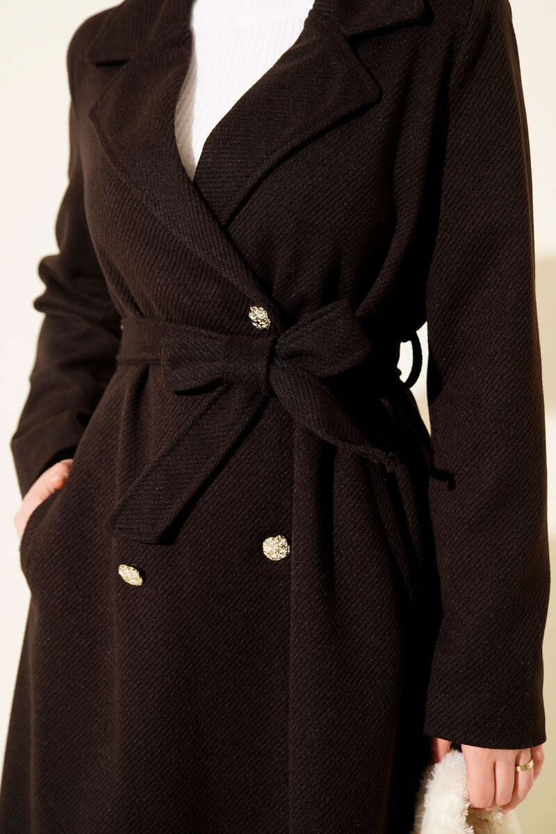 Kuşaklı Gold Düğmeli Kaşe Kaban Siyah