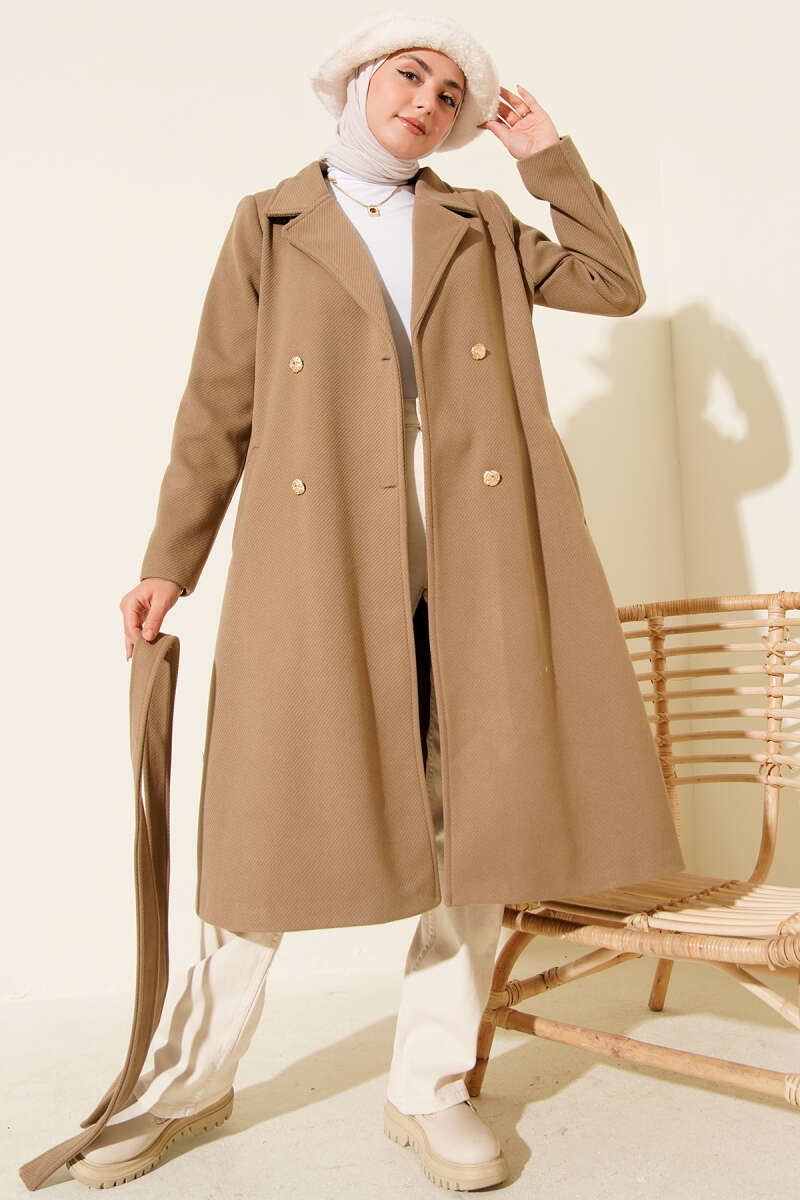 Fitilli Kuşaklı Kaşe Kaban Bej