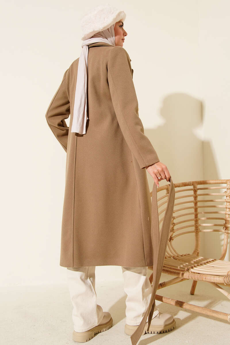 Kol Düğmeli Kuşaklı Kaşe Kaban Kestane