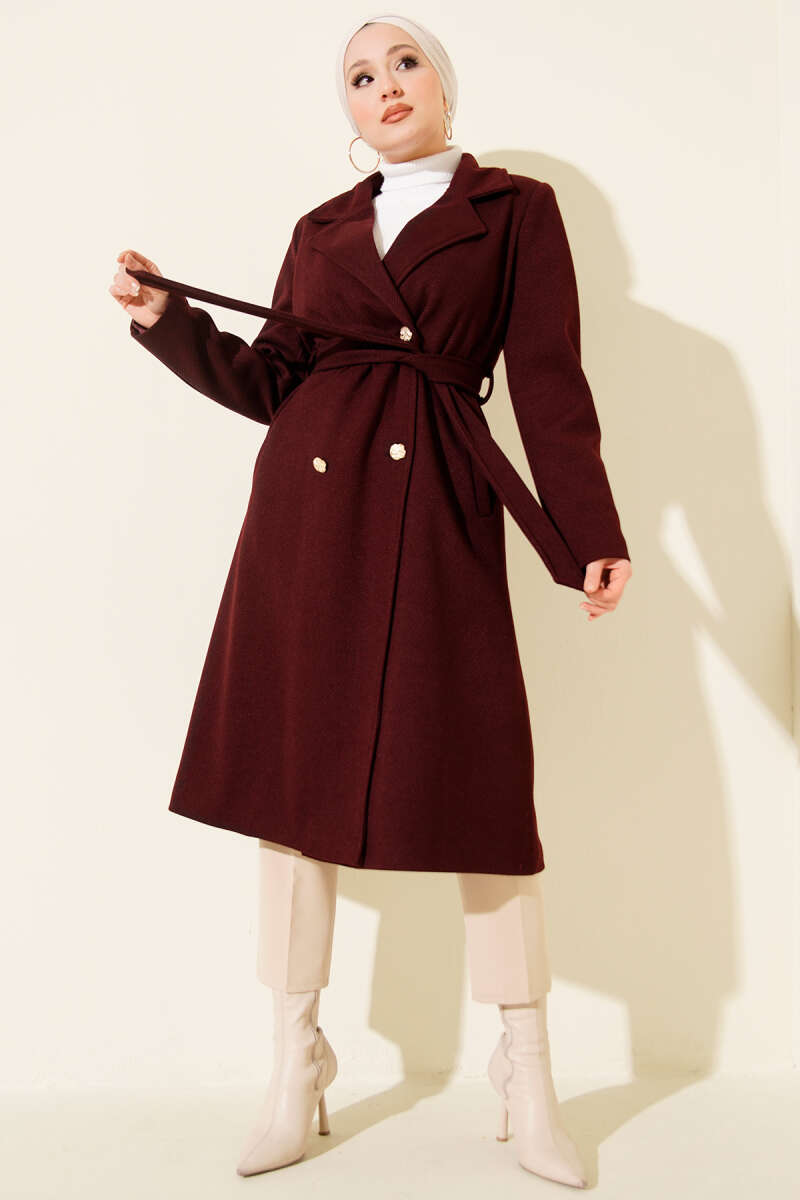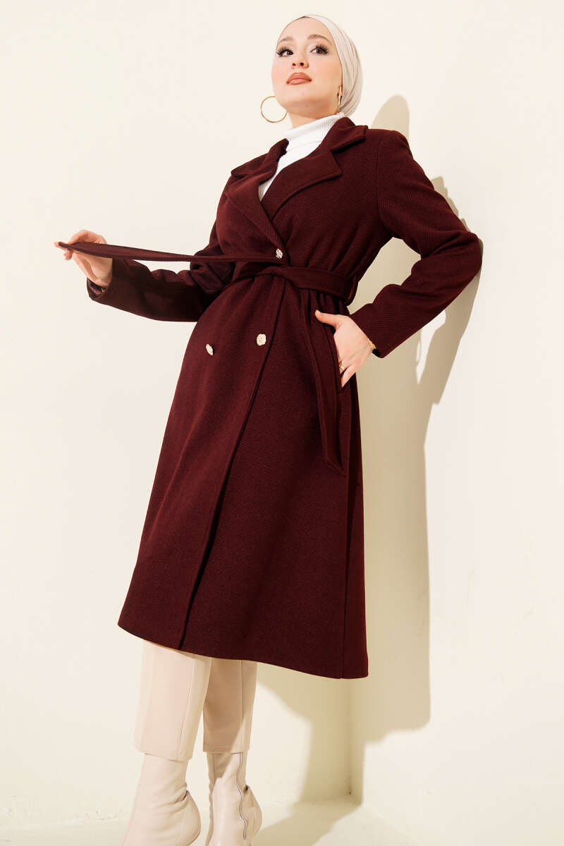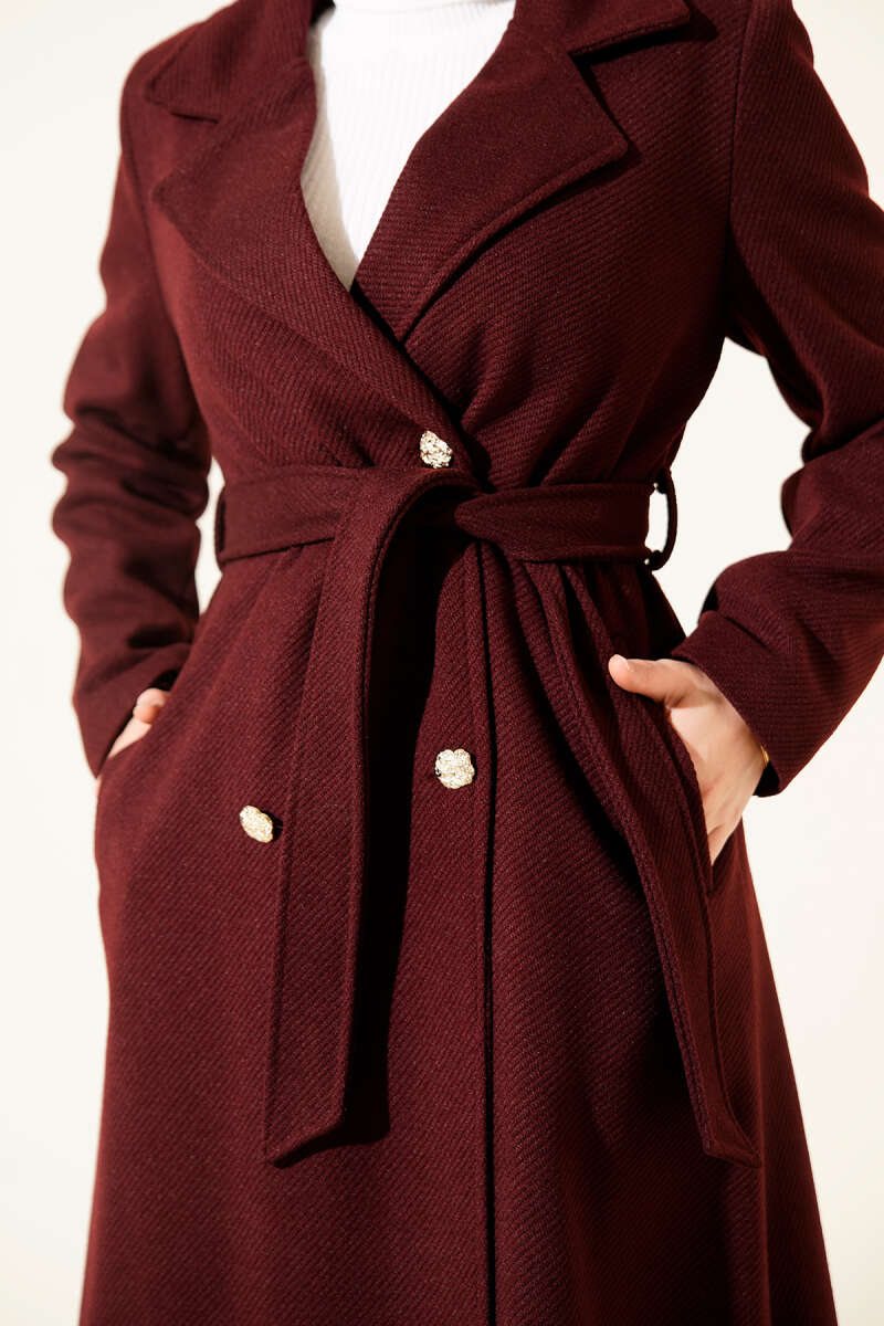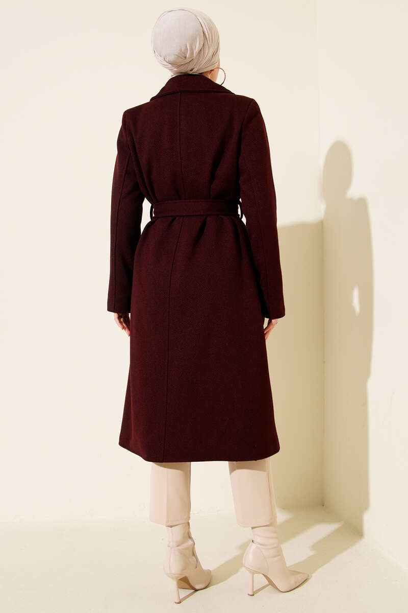 Kruvaze Yaka Uzun Kaşe Kaban Bordo