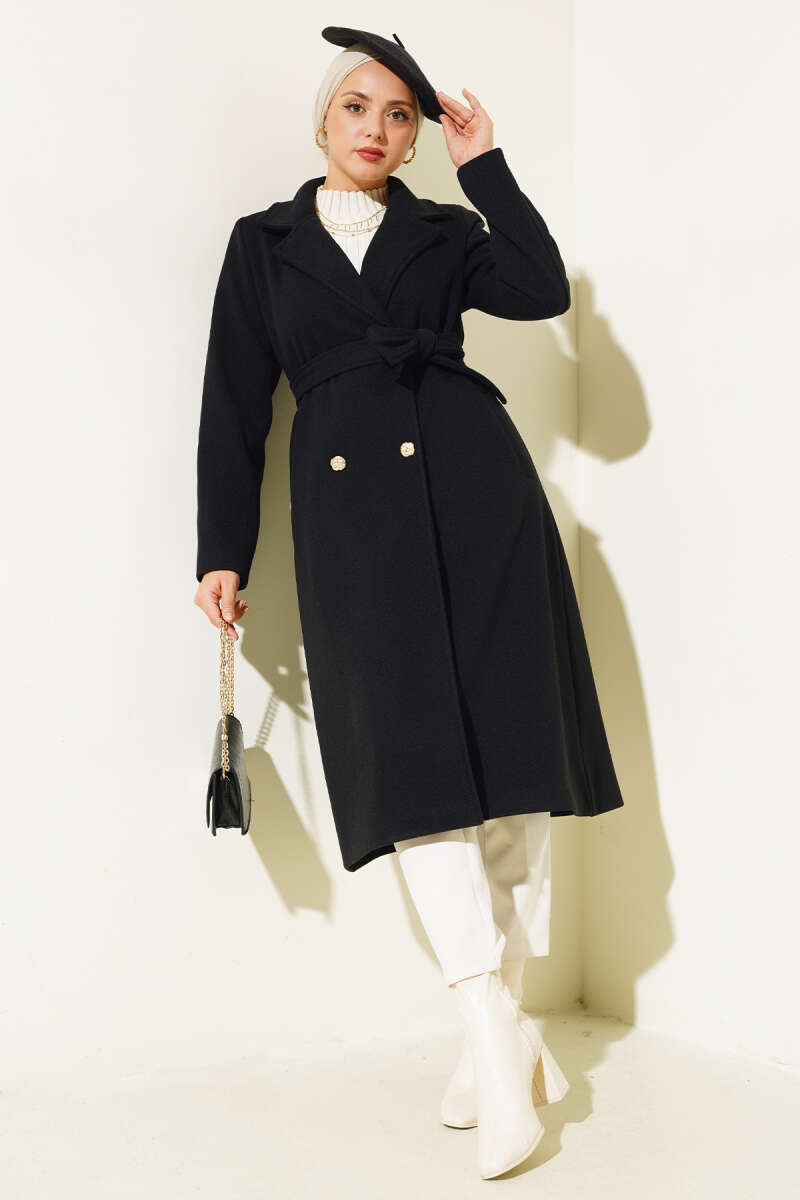 Kruvaze Yaka Uzun Kaşe Kaban Siyah
