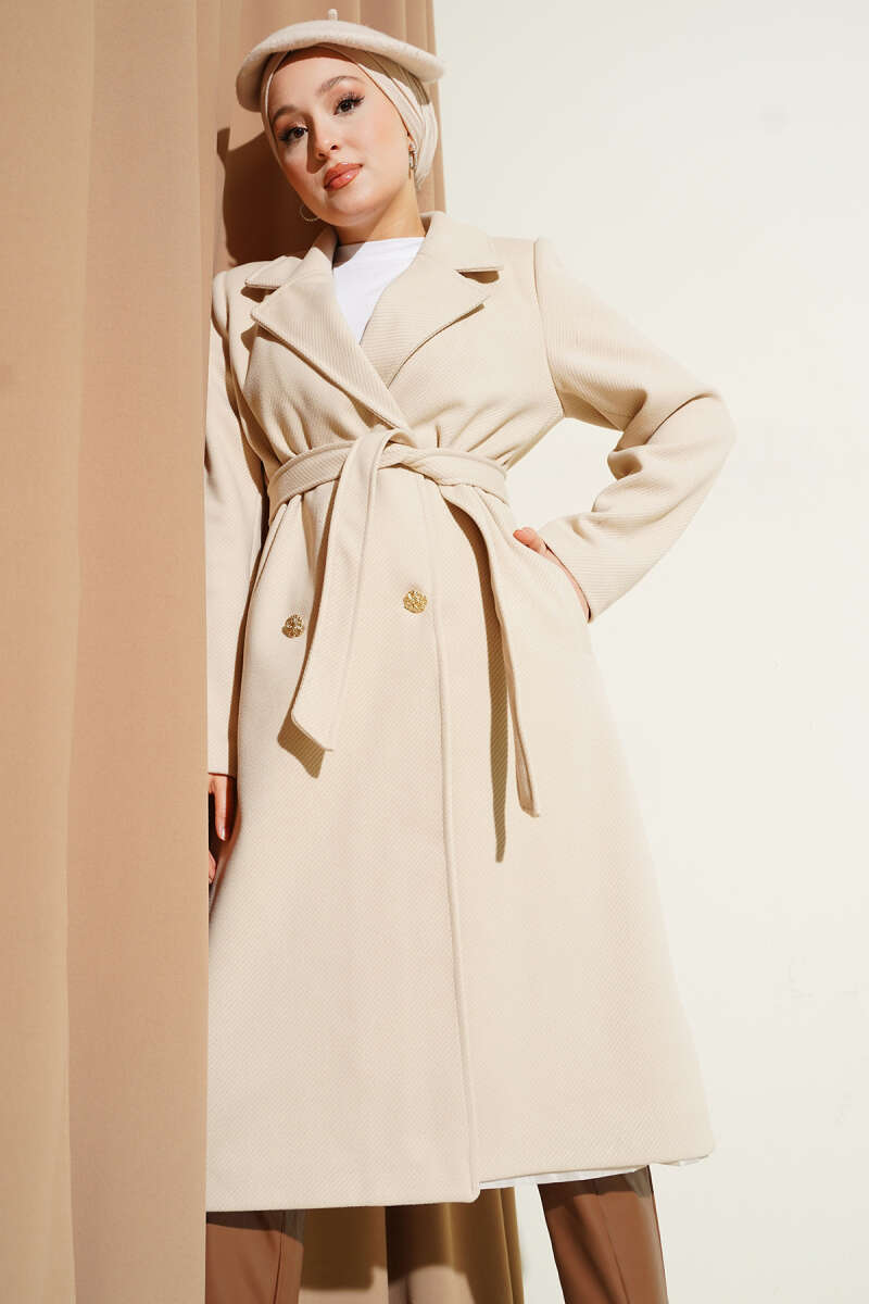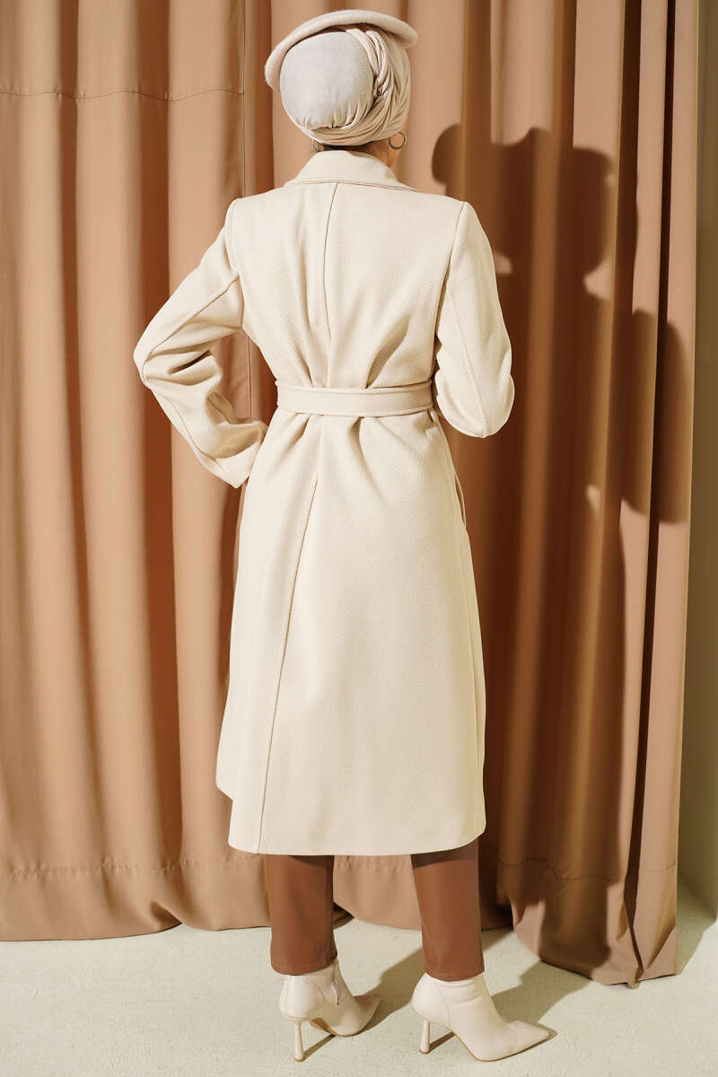 Kruvaze Yaka Uzun Kaşe Kaban Bej