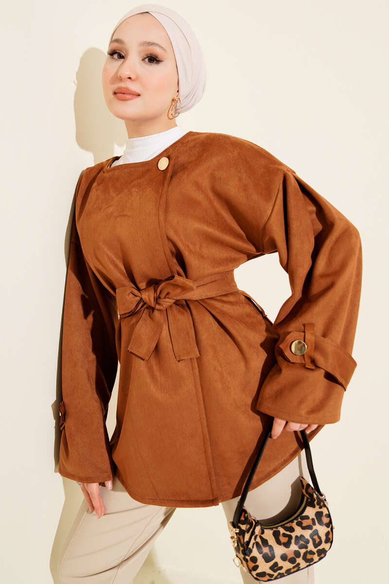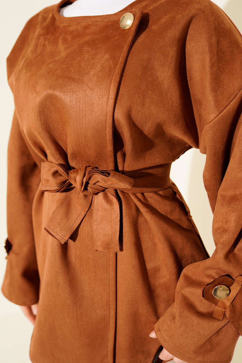 Gold Düğmeli Kuşaklı Süet Ceket Pudra