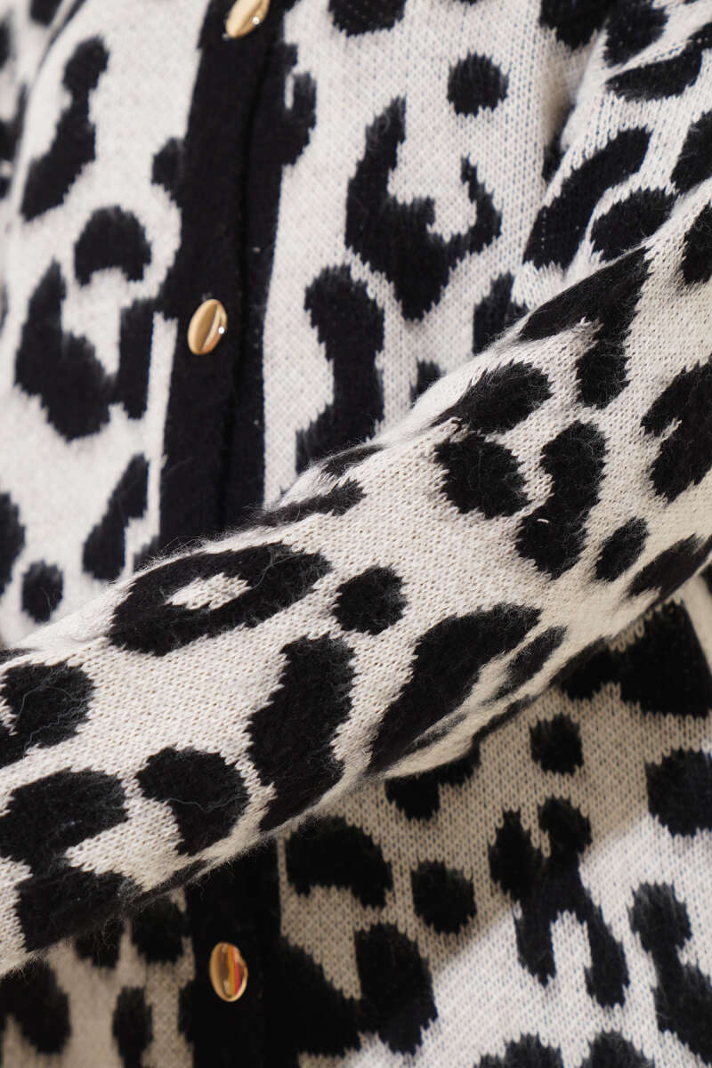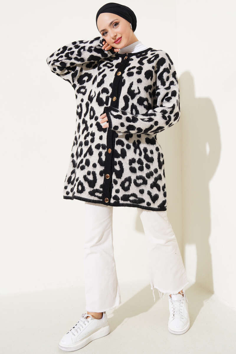 Gold Düğmeli Leopar Desen Triko Hırka Taş