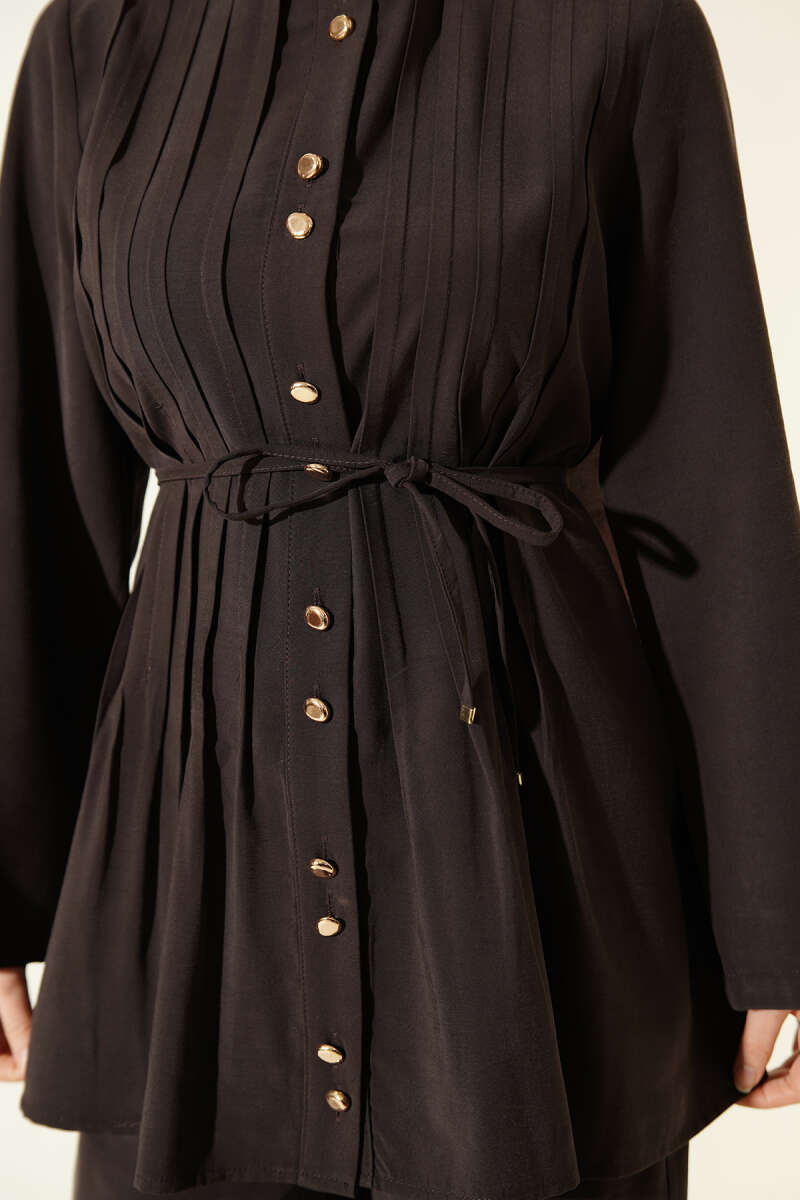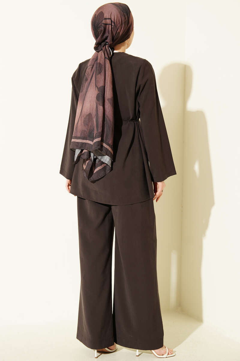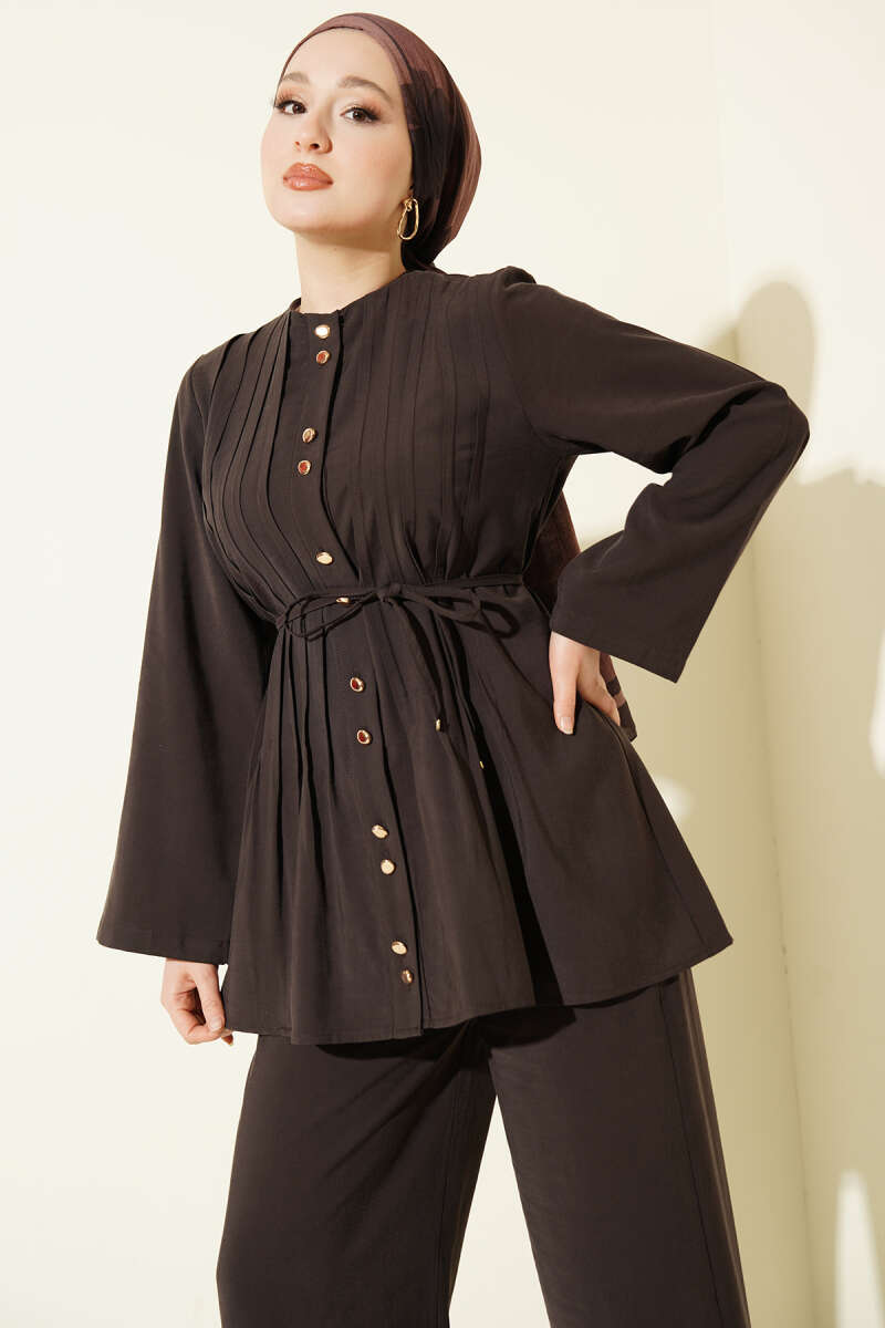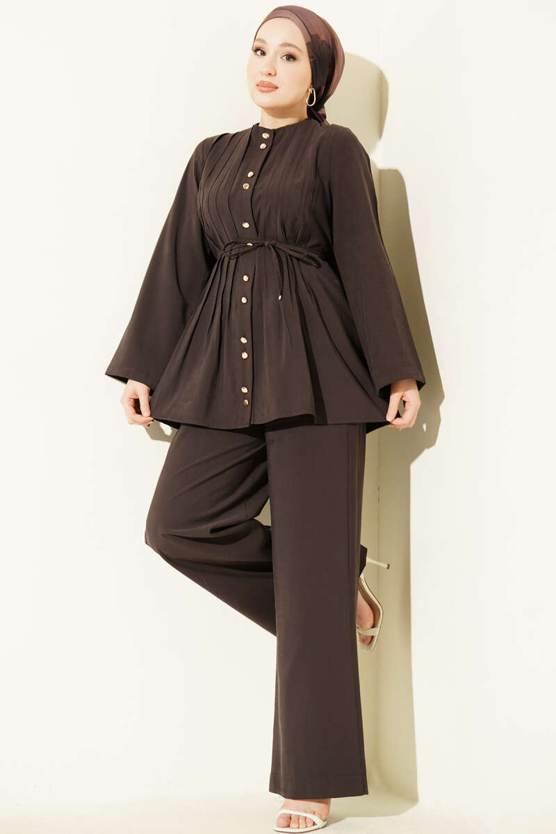 Gold Düğmeli Nervürlü Tensel İkili Takım Kahve