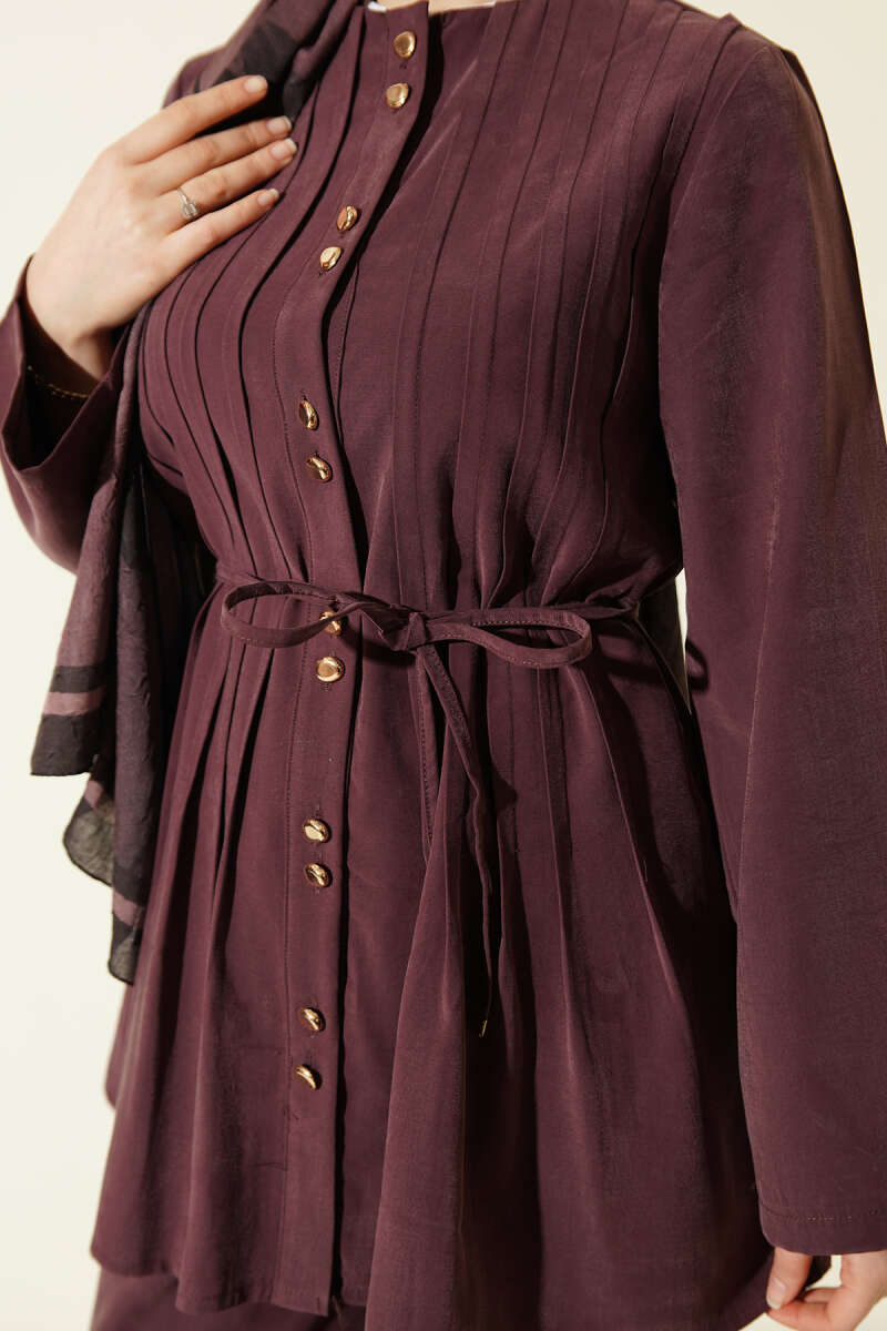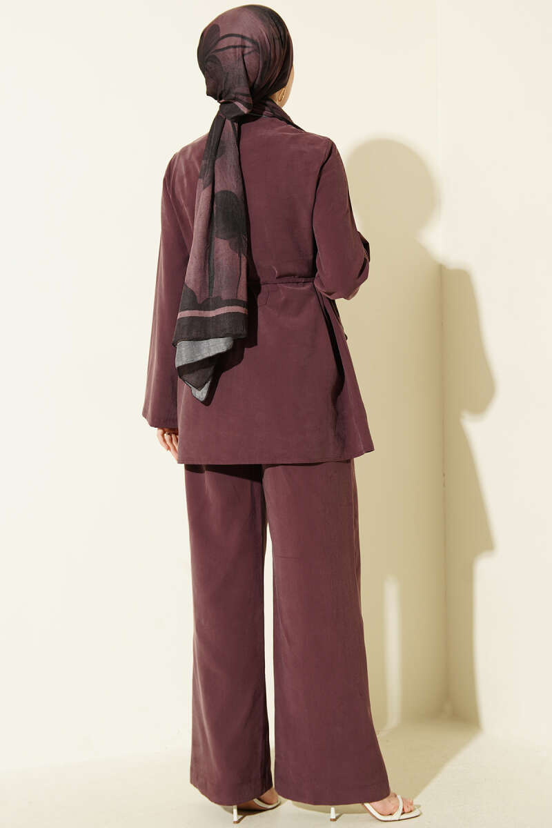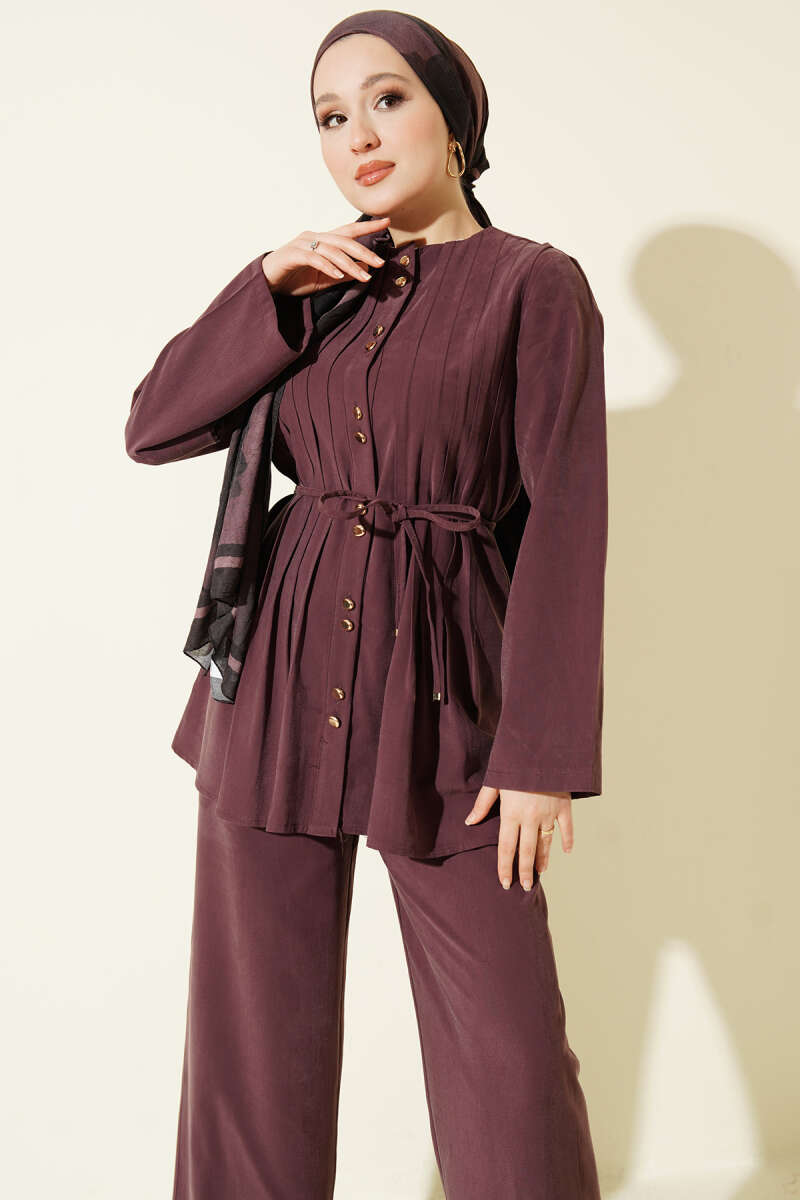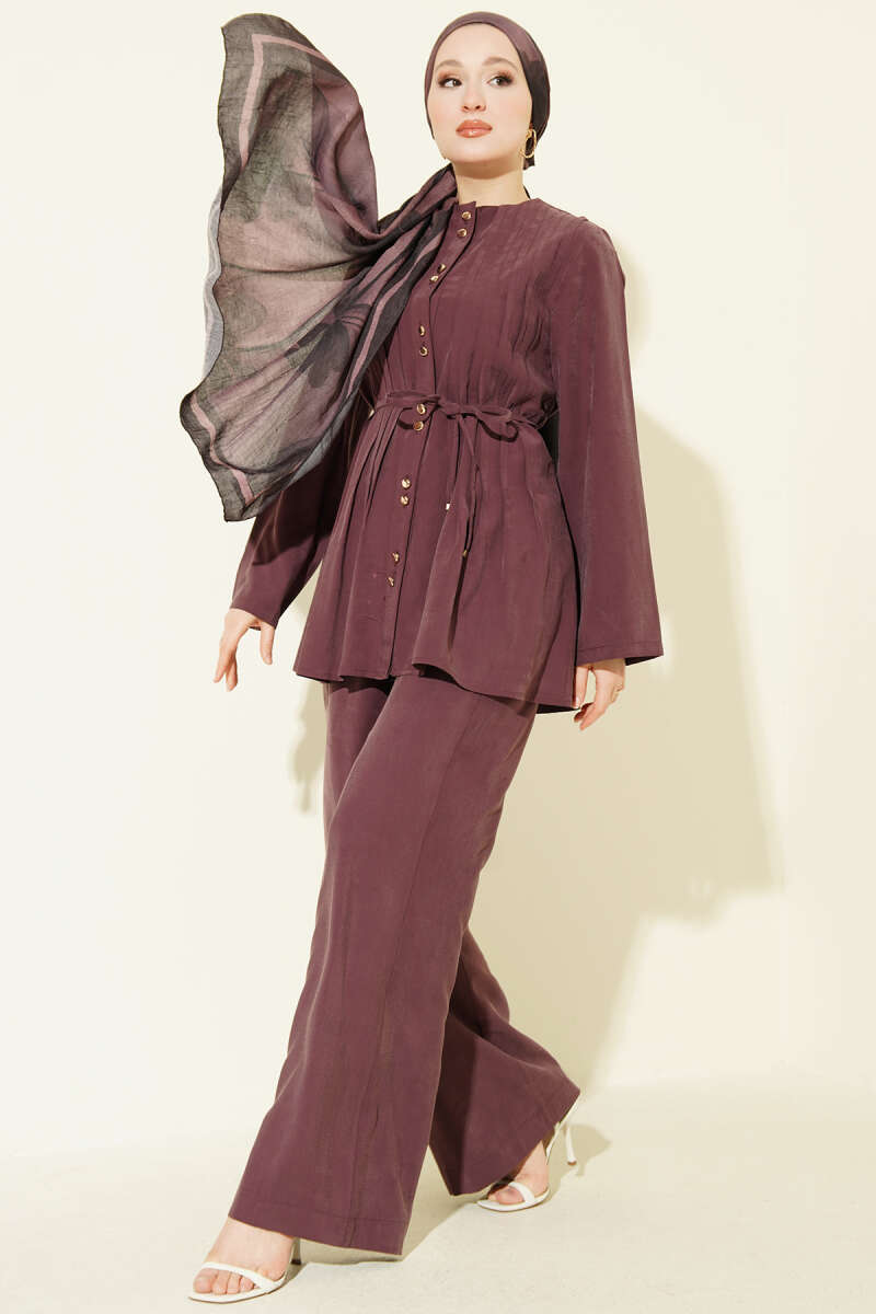 Gold Düğmeli Nervürlü Tensel İkili Takım Mürdüm