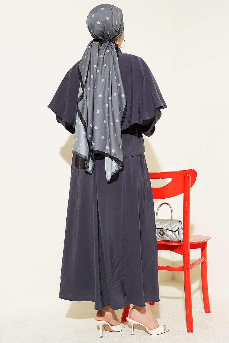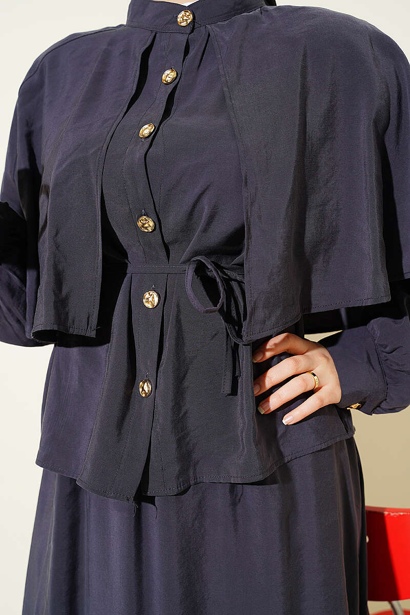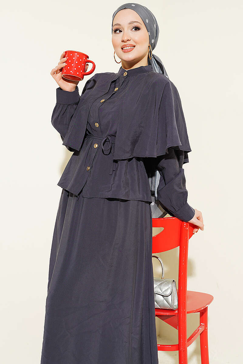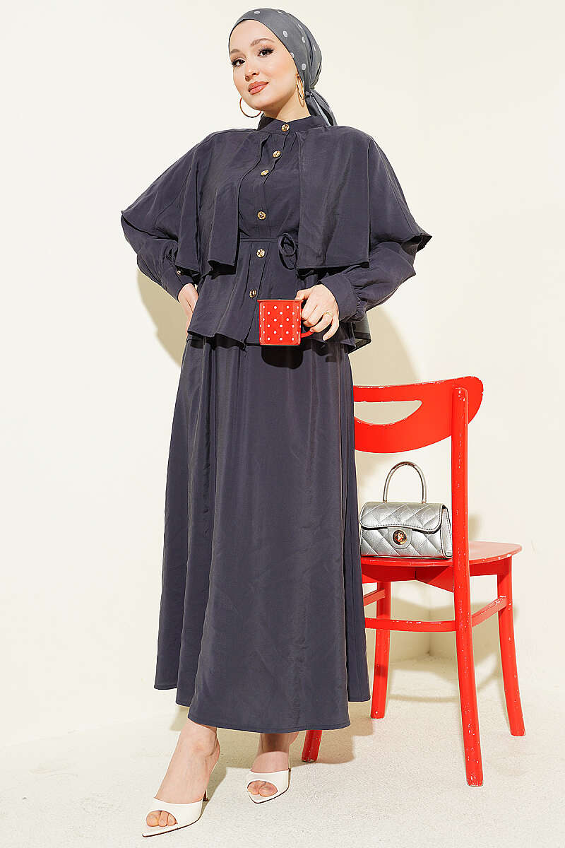 Gold Düğmeli Pelerinli Modal Etekli Takım Antrasit