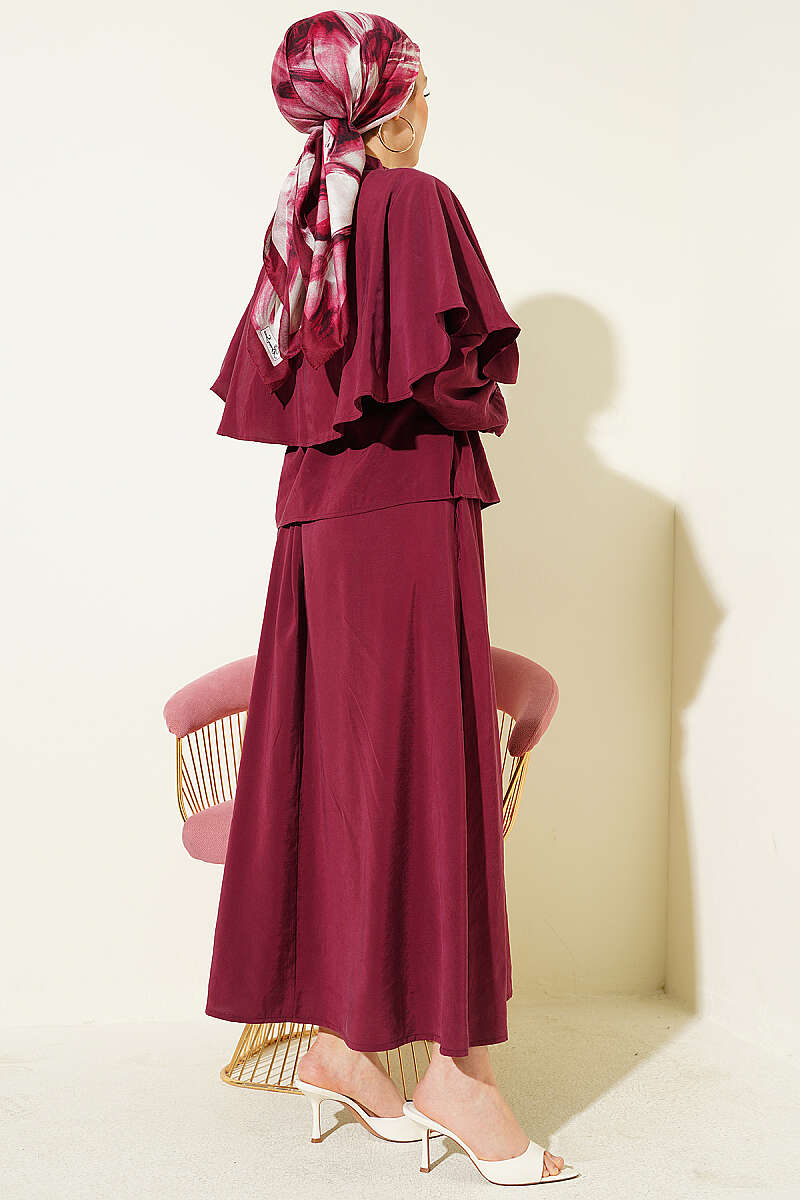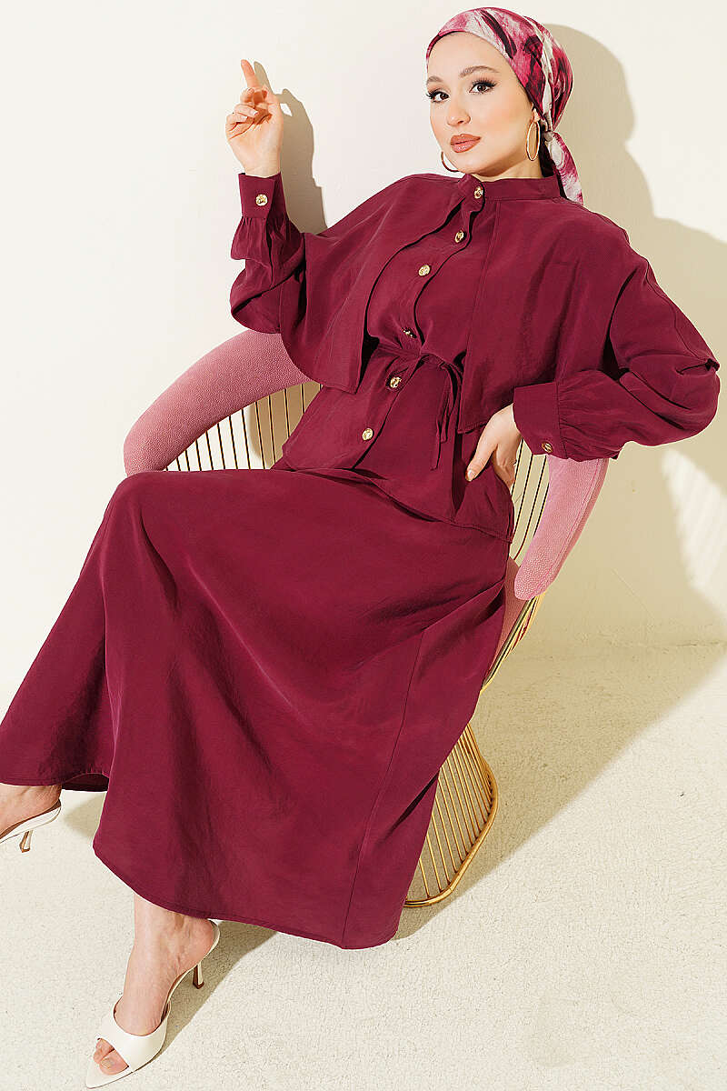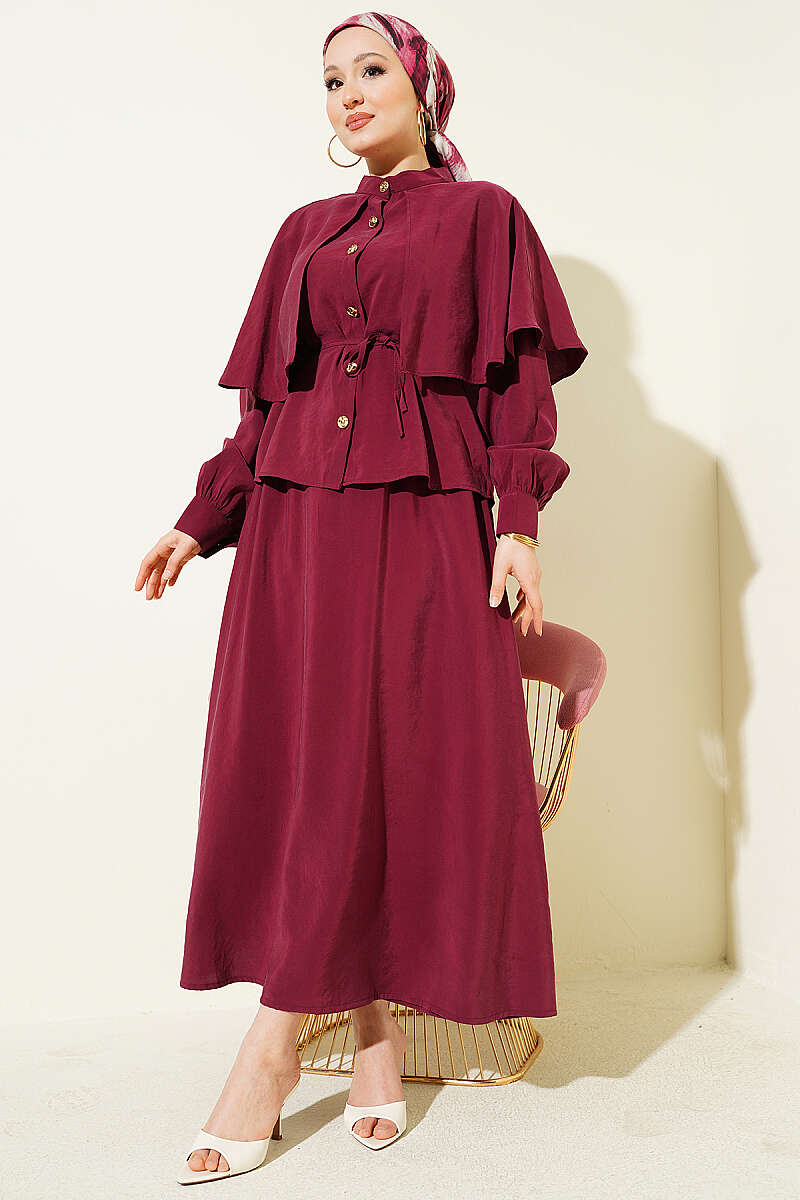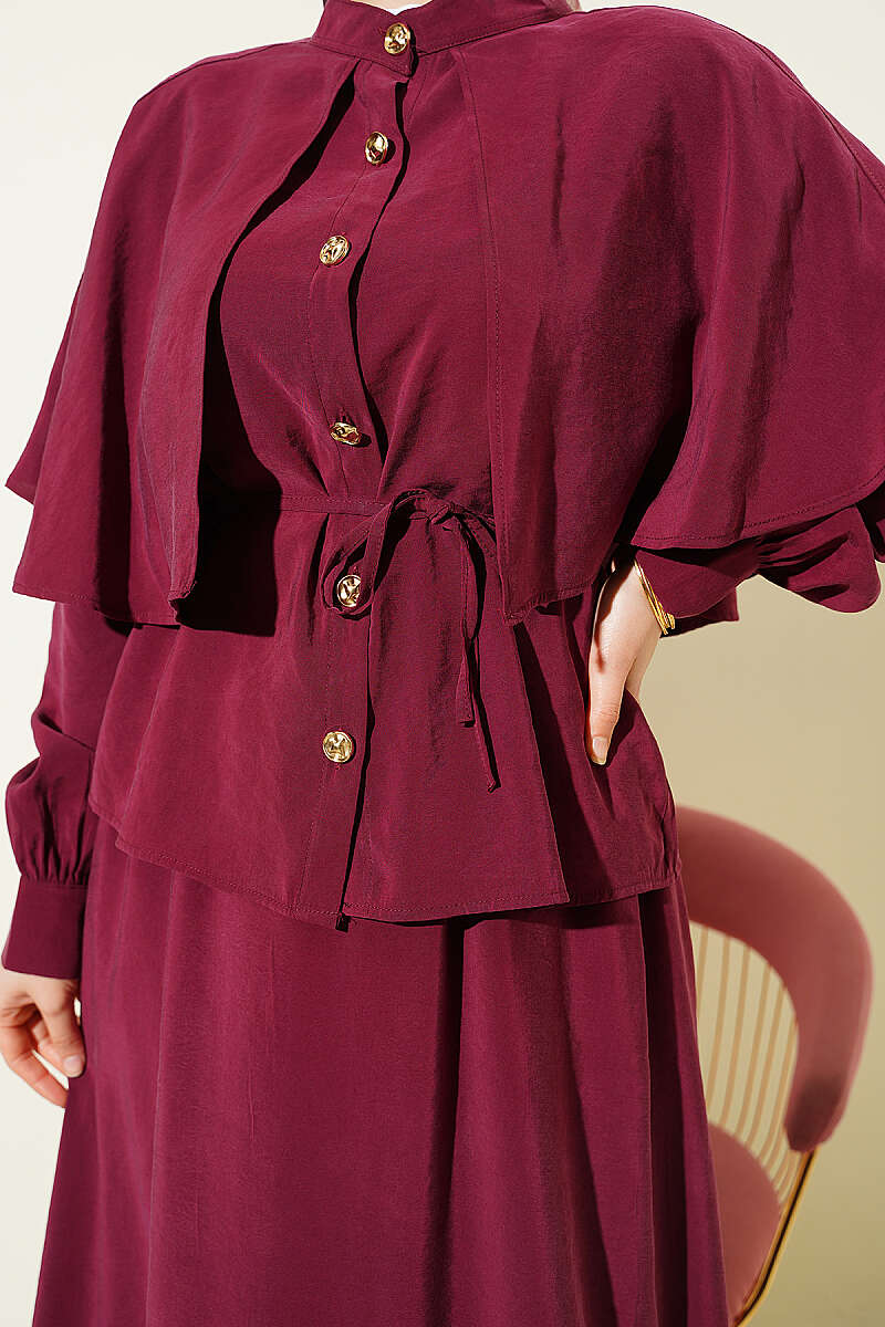Gold Düğmeli Pelerinli Modal Etekli Takım Bordo