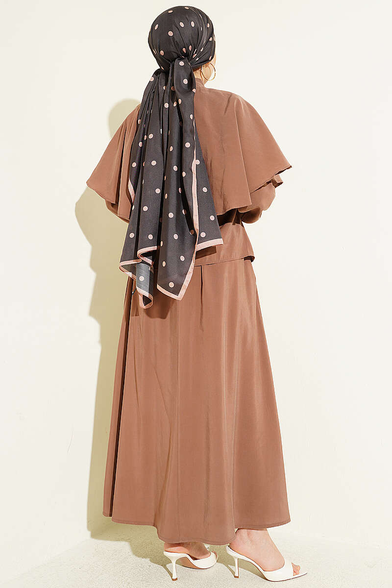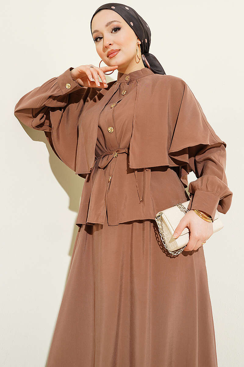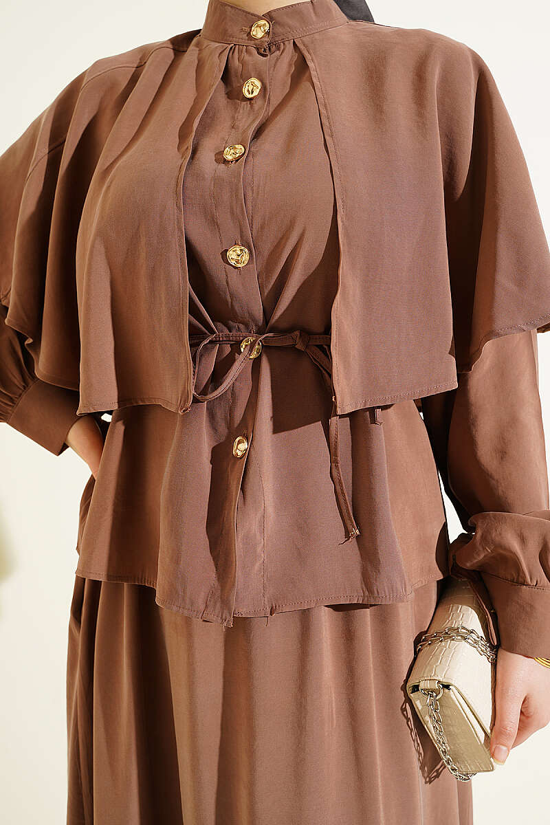 Gold Düğmeli Pelerinli Modal Etekli Takım Kahve