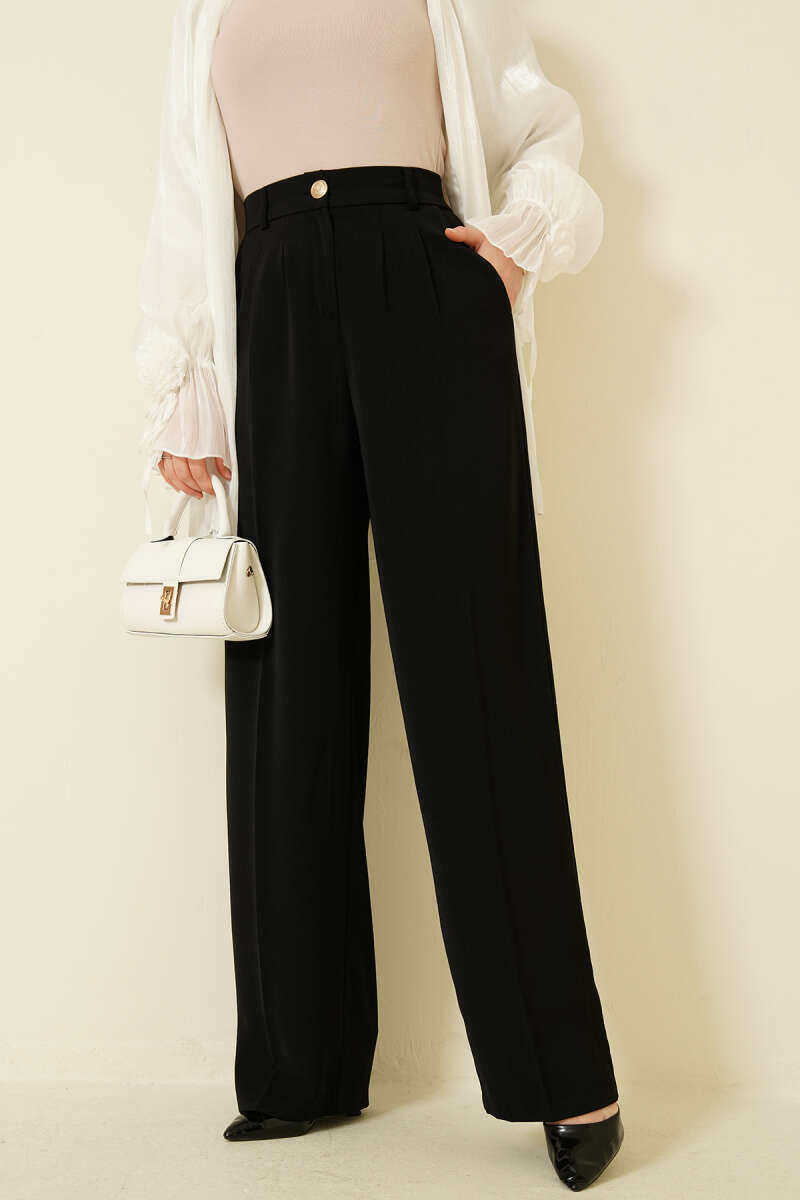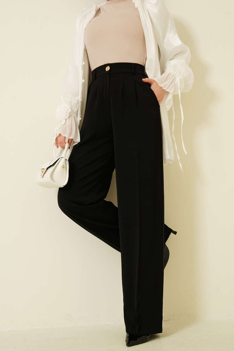 Gold Düğmeli Pileli Palazzo Pantolon Siyah