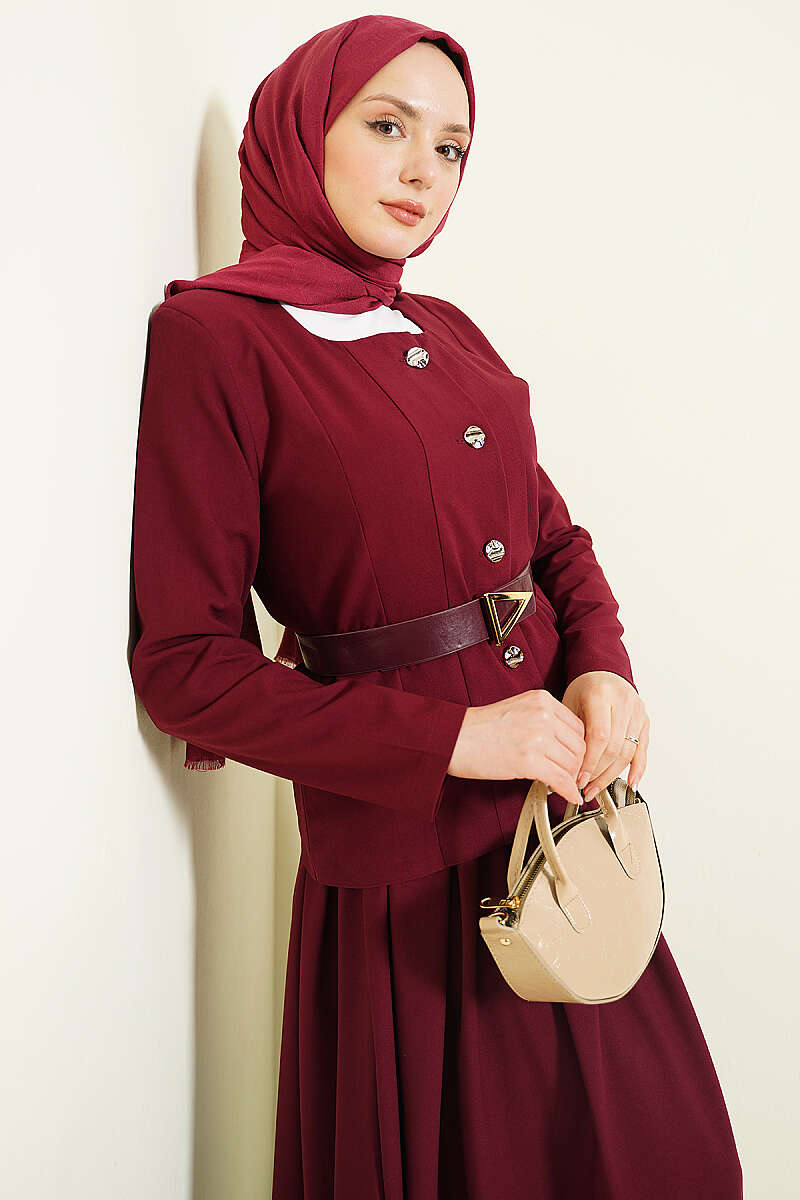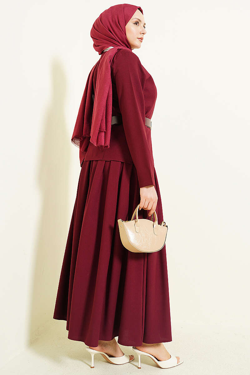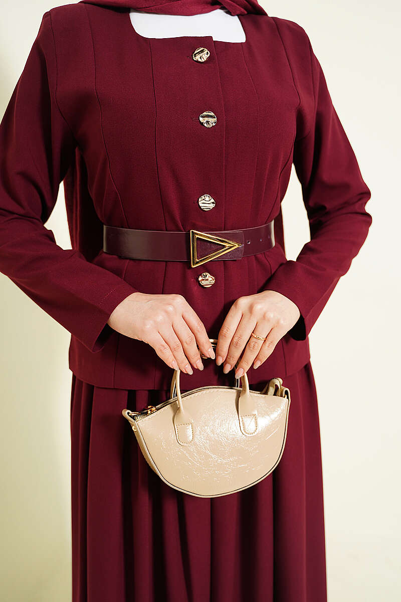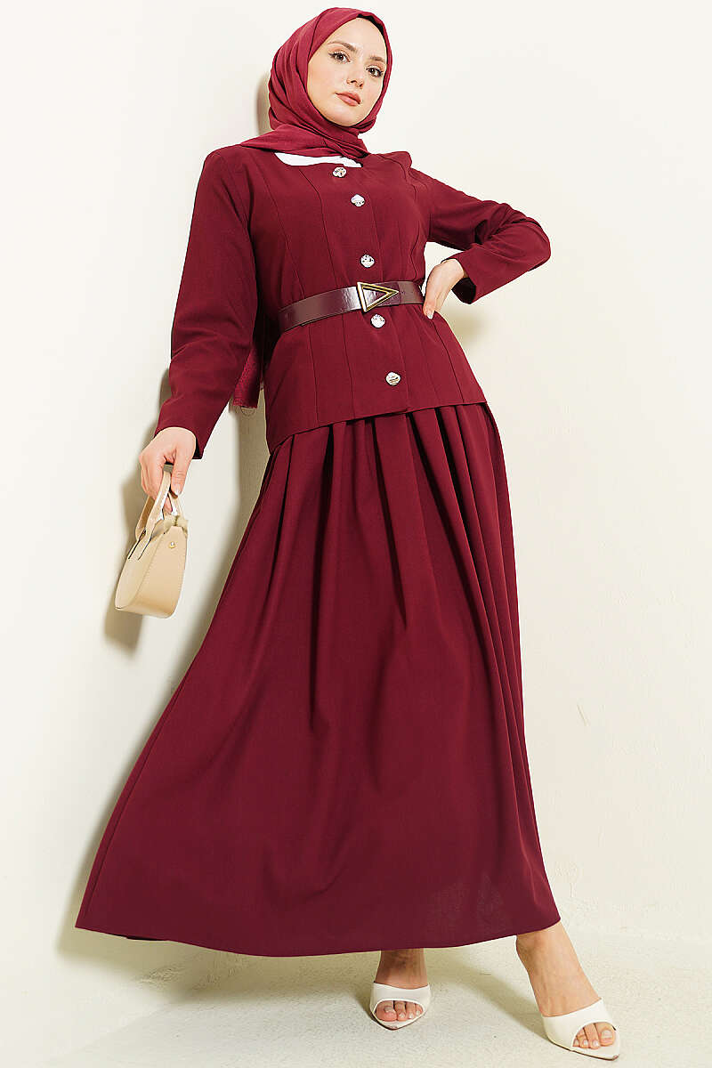 Gold Düğmeli Poliviskon Etekli Takım Bordo