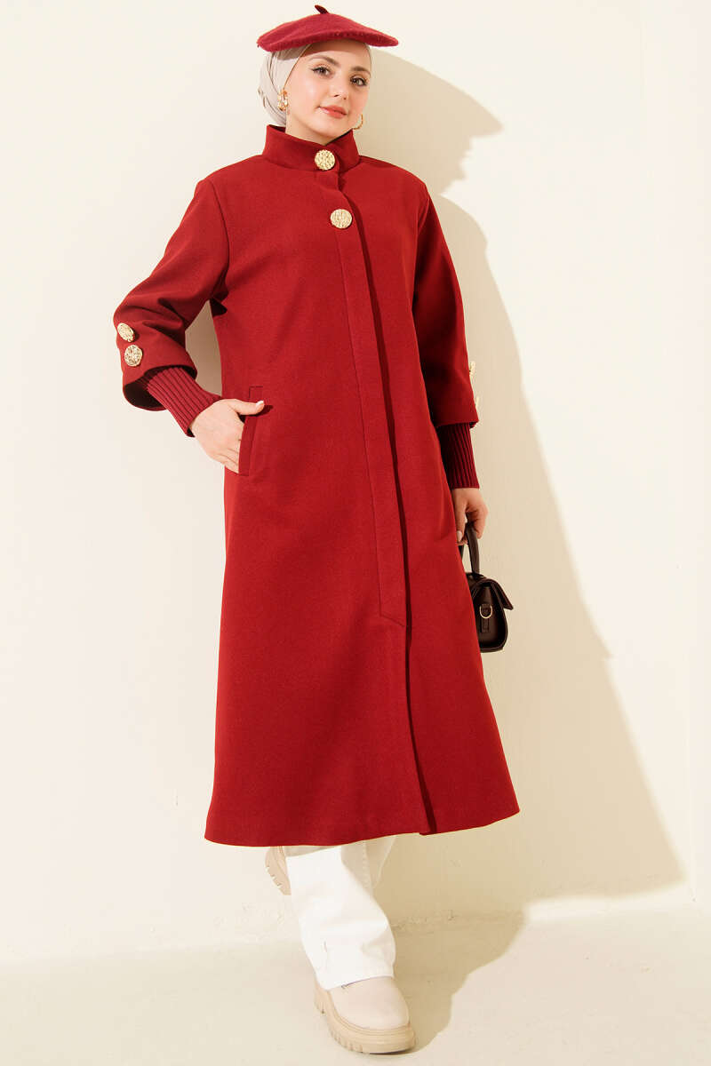Midye Dikişli Kuşaklı Kaşe Kaban Mürdüm
