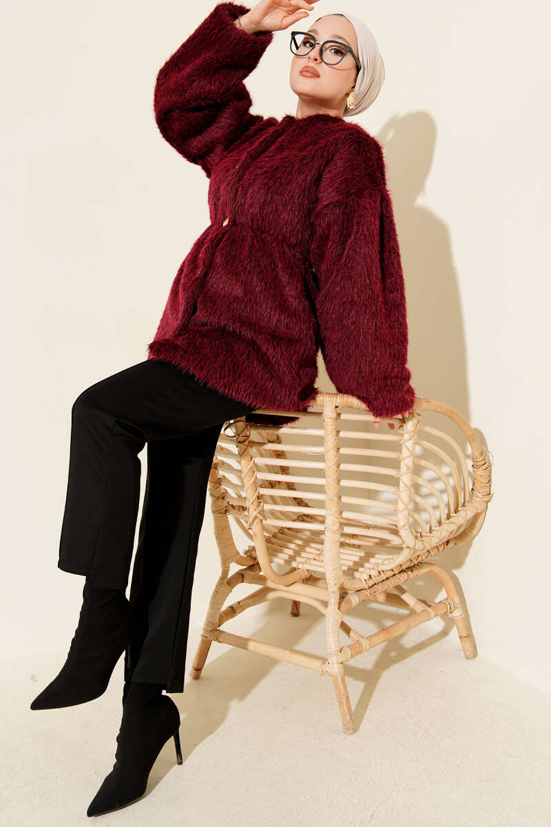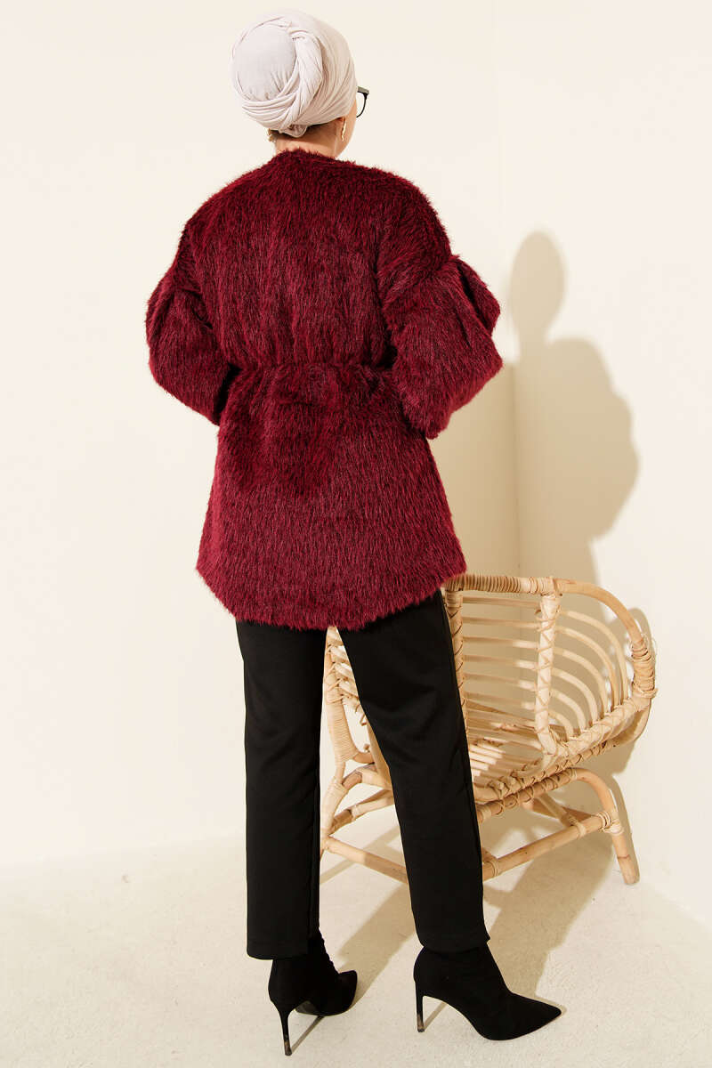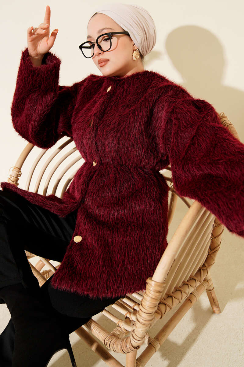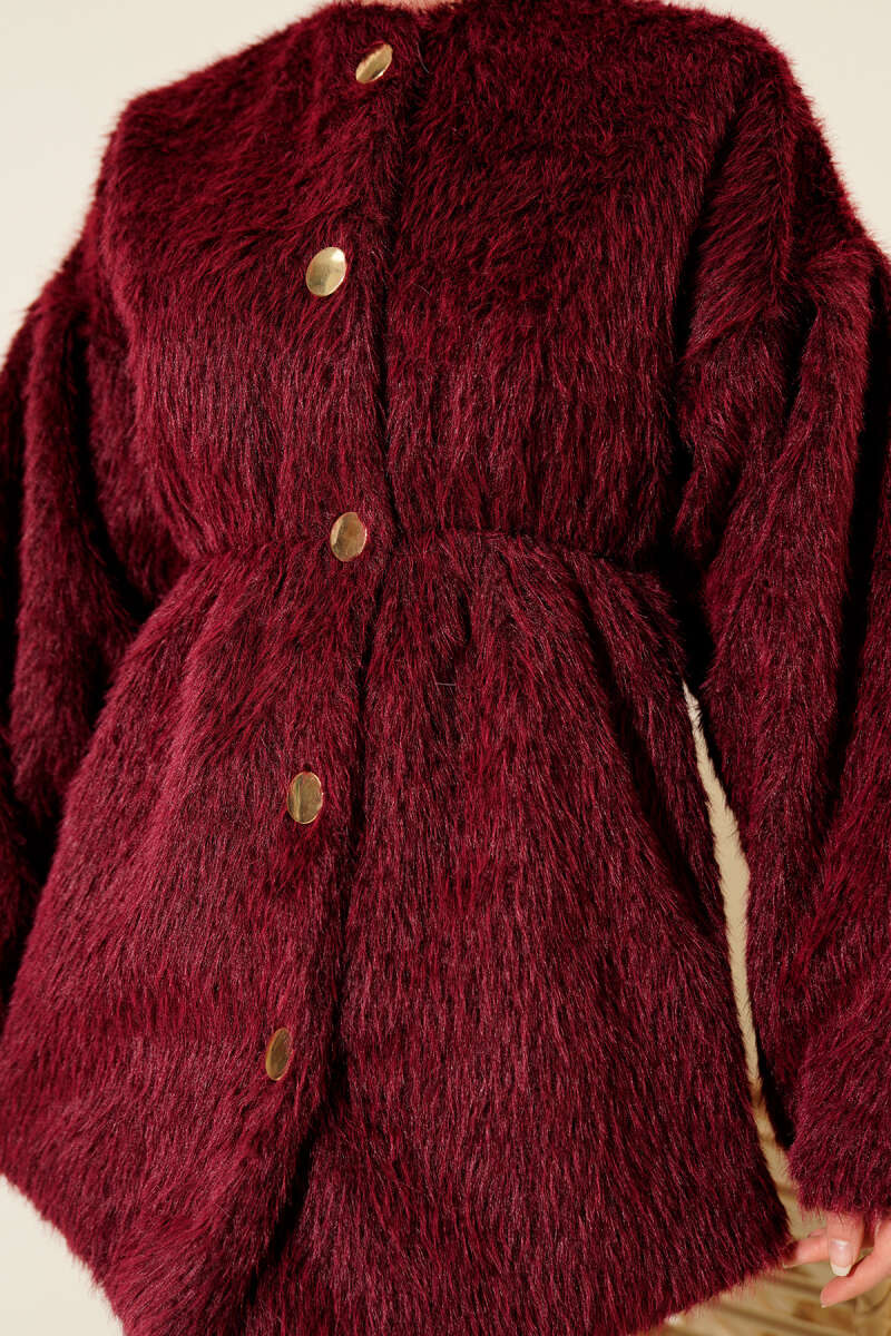 Kürk Yakalı Düğmeli Kaşe Kaban Mürdüm