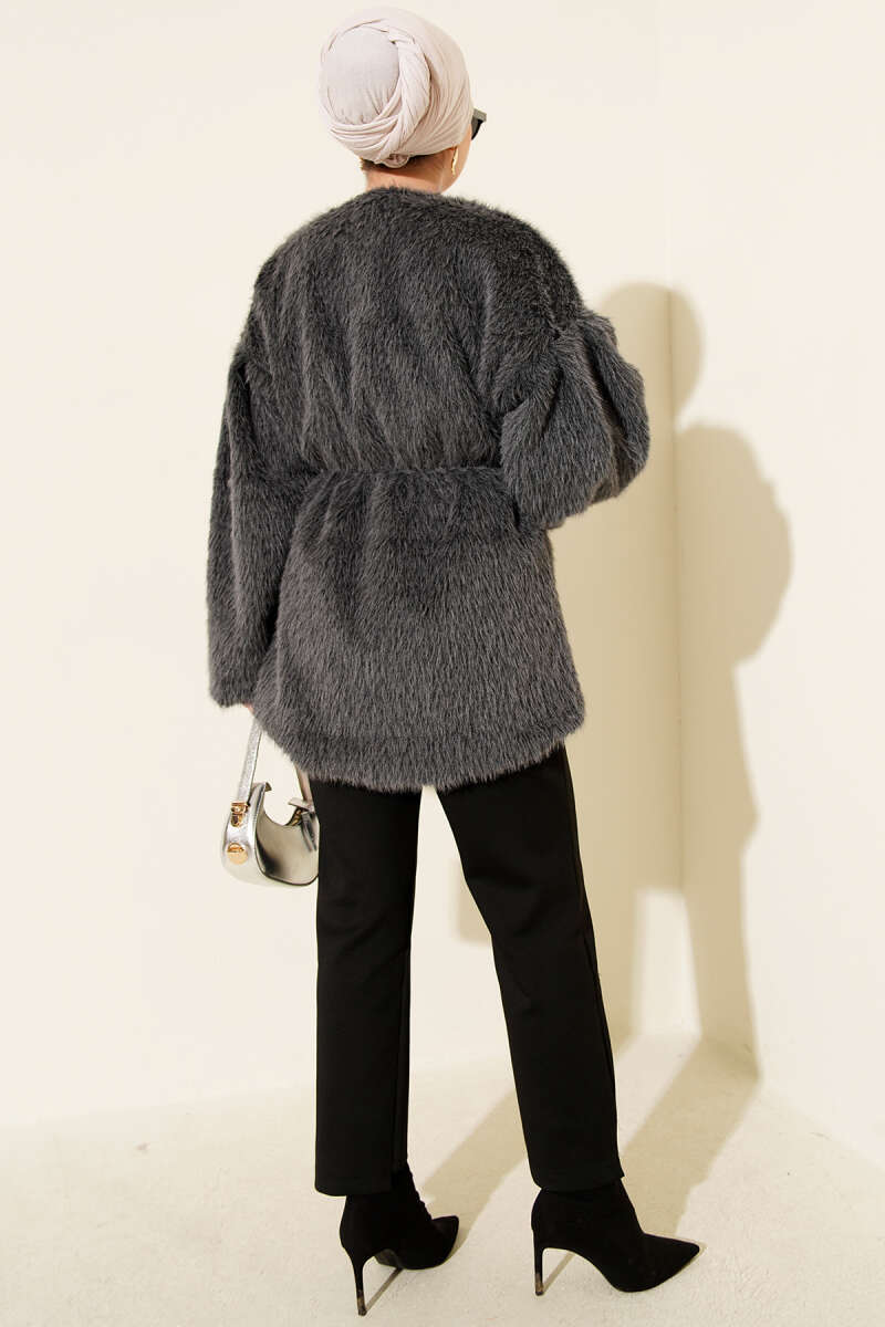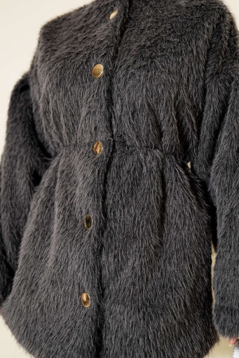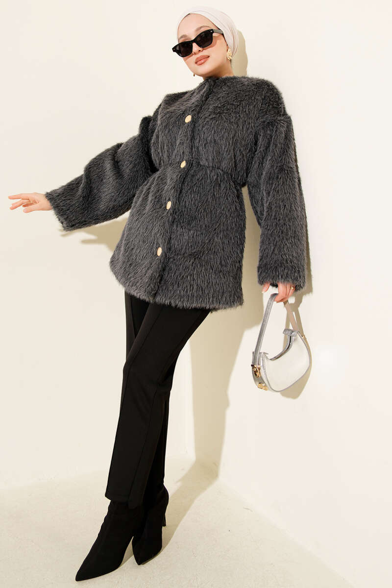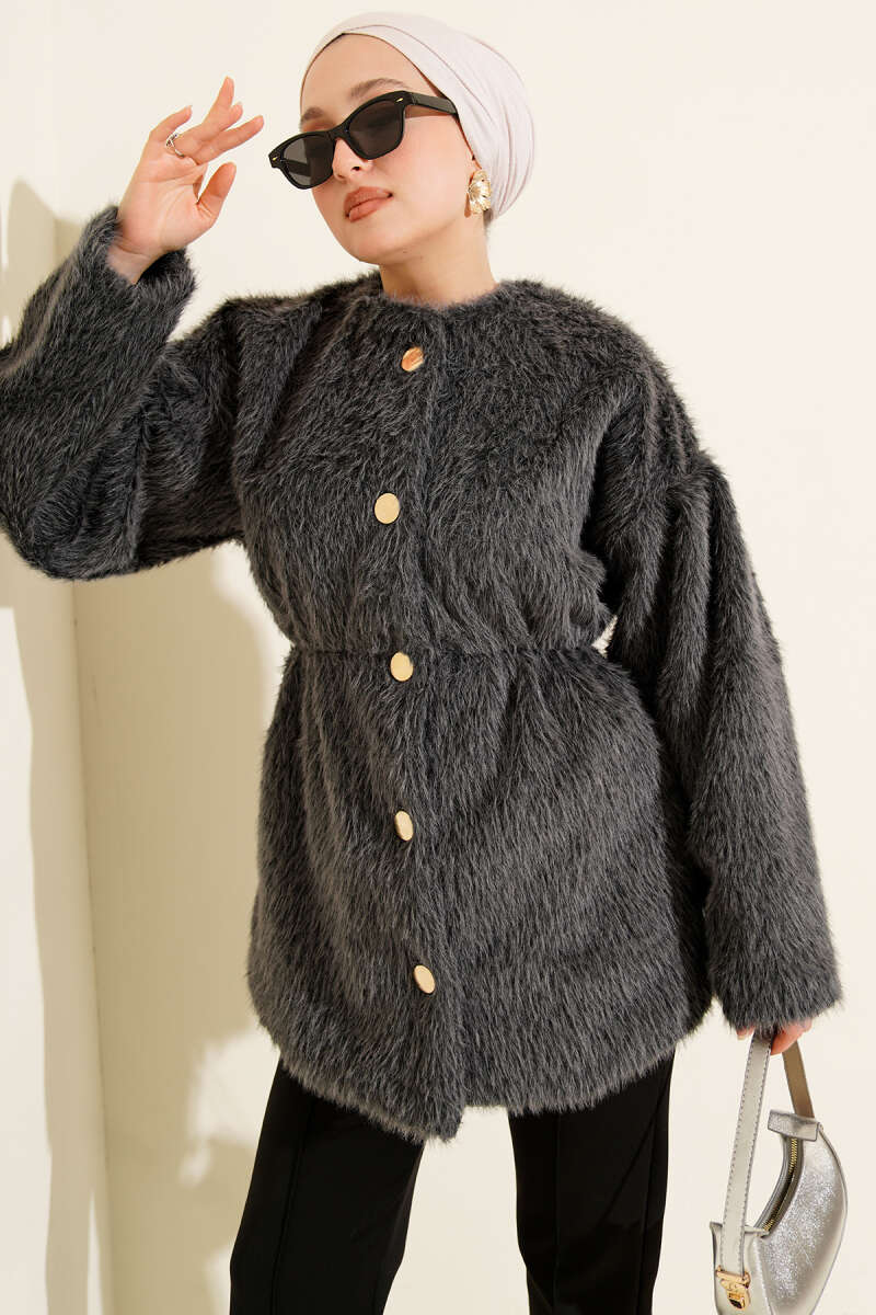 Kuşaklı Düğmeli Kaşe Kaban Füme
