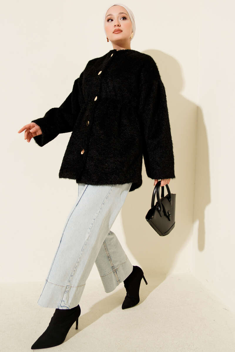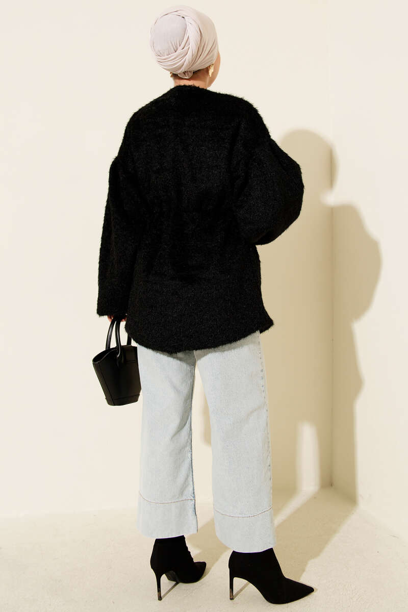 Gömlek Yaka Düğmeli Kaşe Panço Siyah