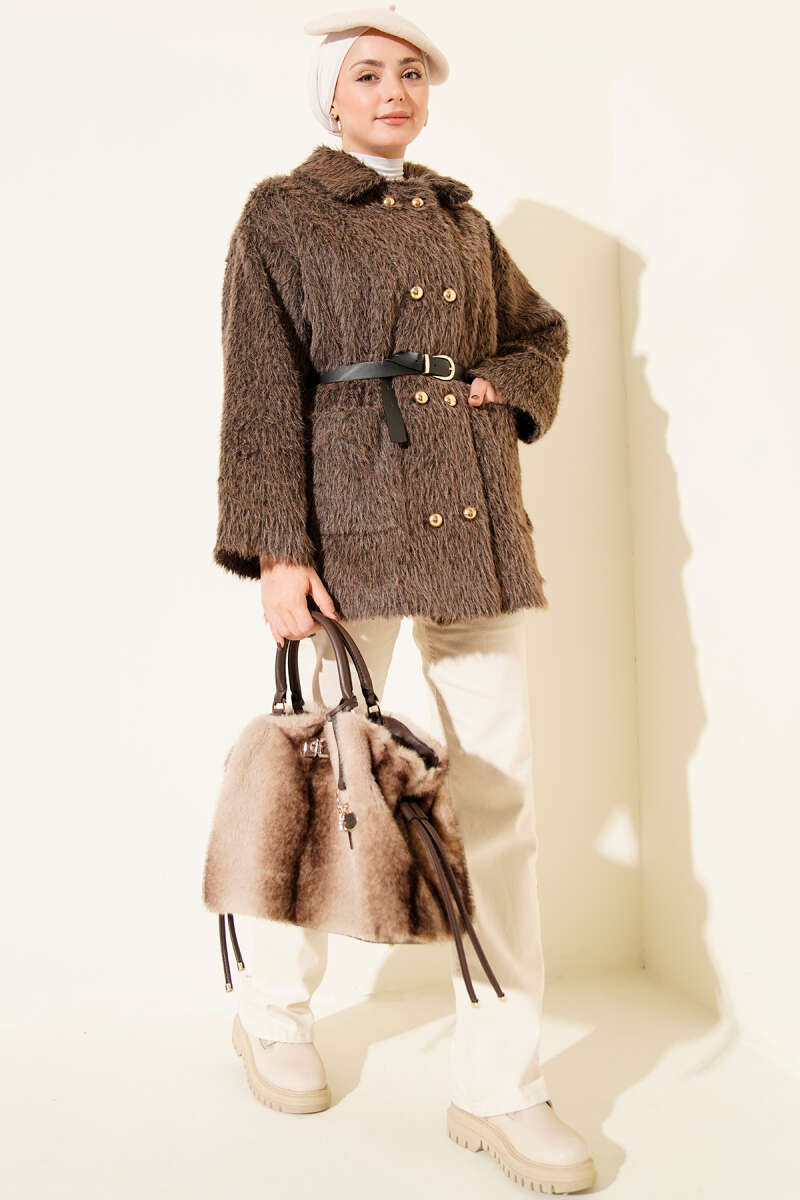 Kot Garnili Çıtçıtlı Peluş Ceket Kahve