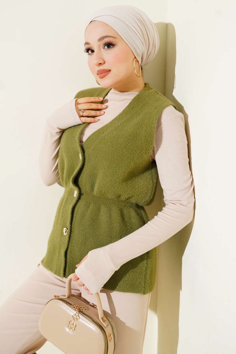 Fırfır Detaylı Düğmeli Triko Yelek Haki