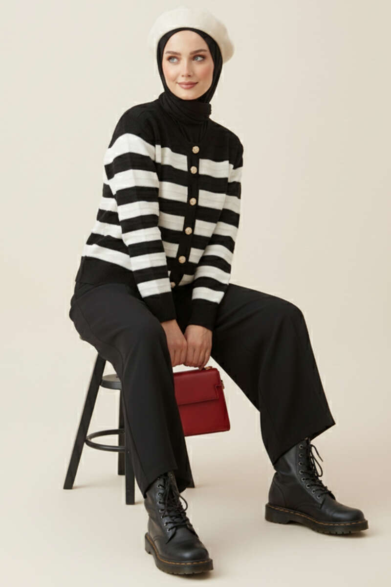 Yatay Çizgili Düşük Omuz Triko Tunik Siyah