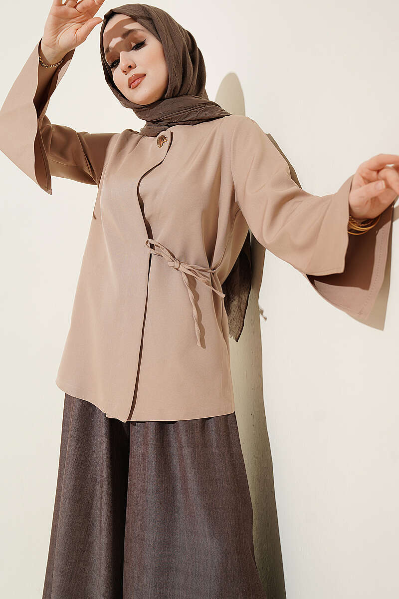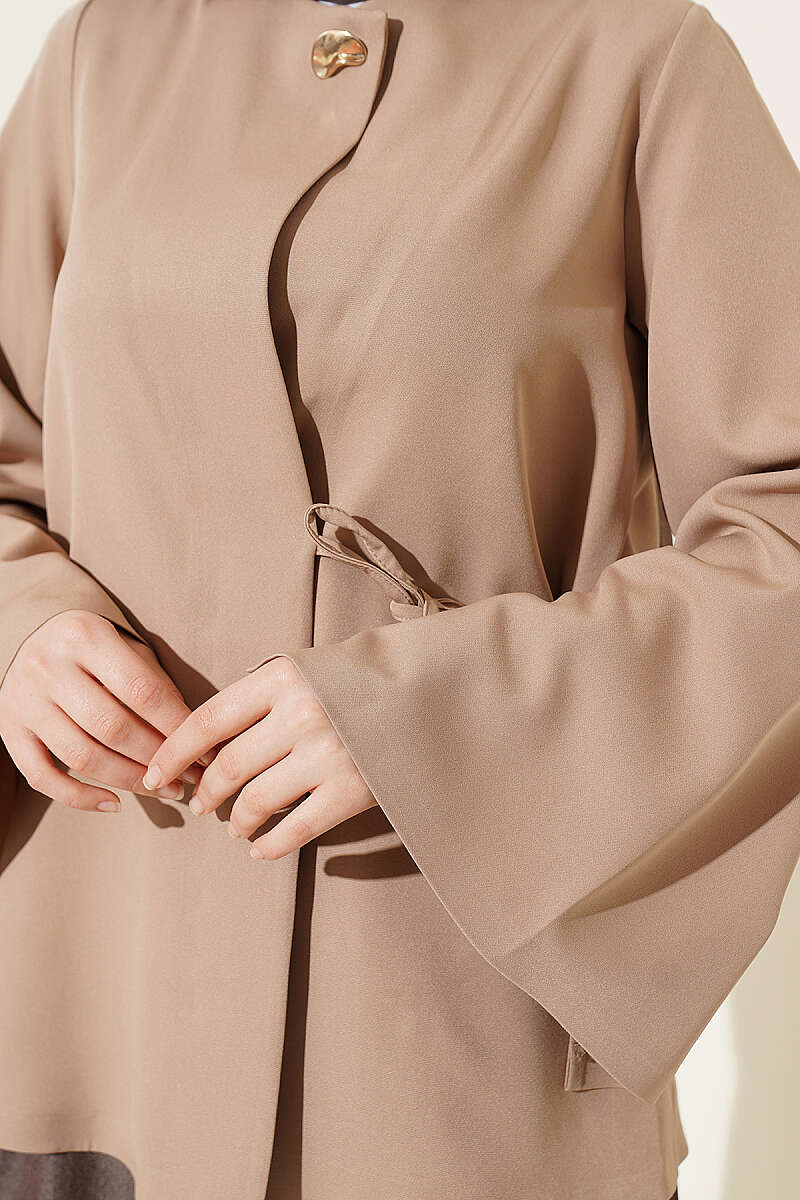 Gold Düğmeli Yan Bağlamalı Kimono Bej