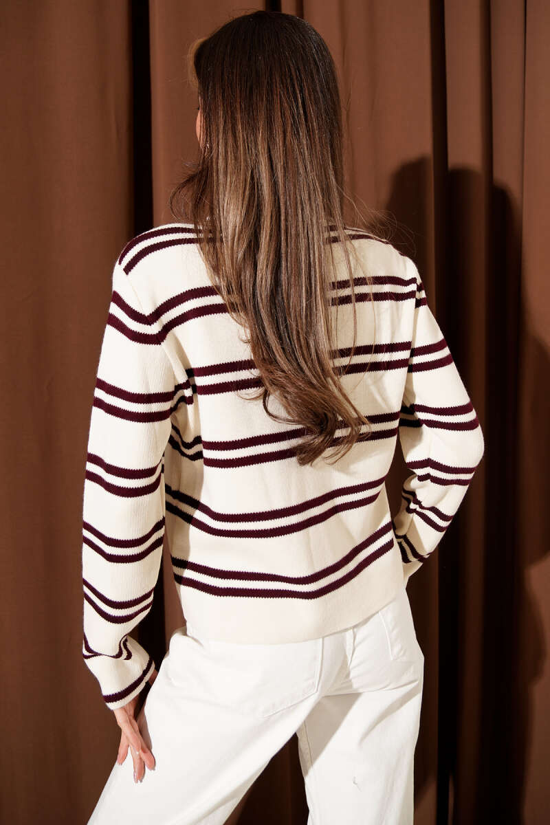 Gold Düğmeli Yan Çizgili Triko Hırka Bej Bordo
