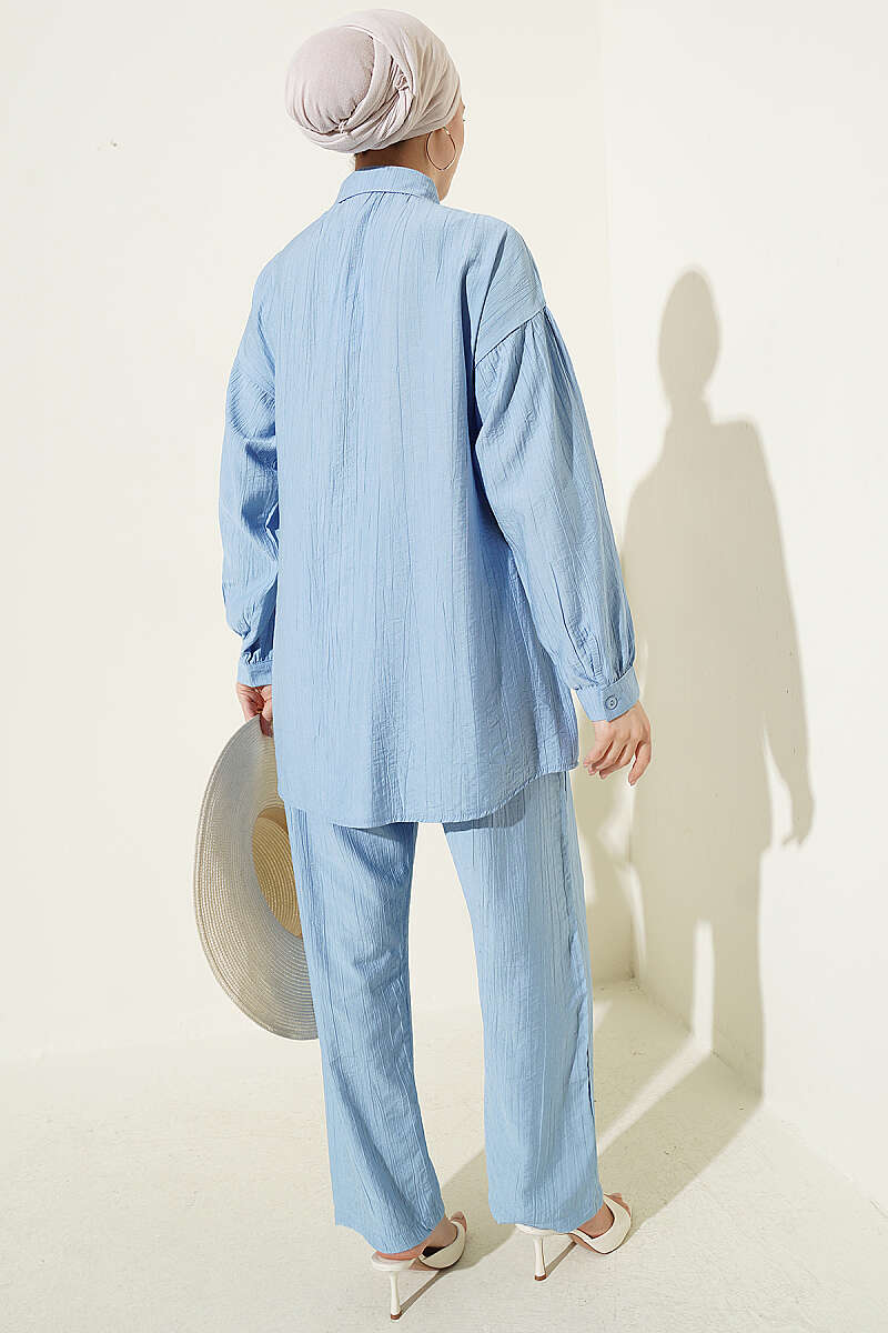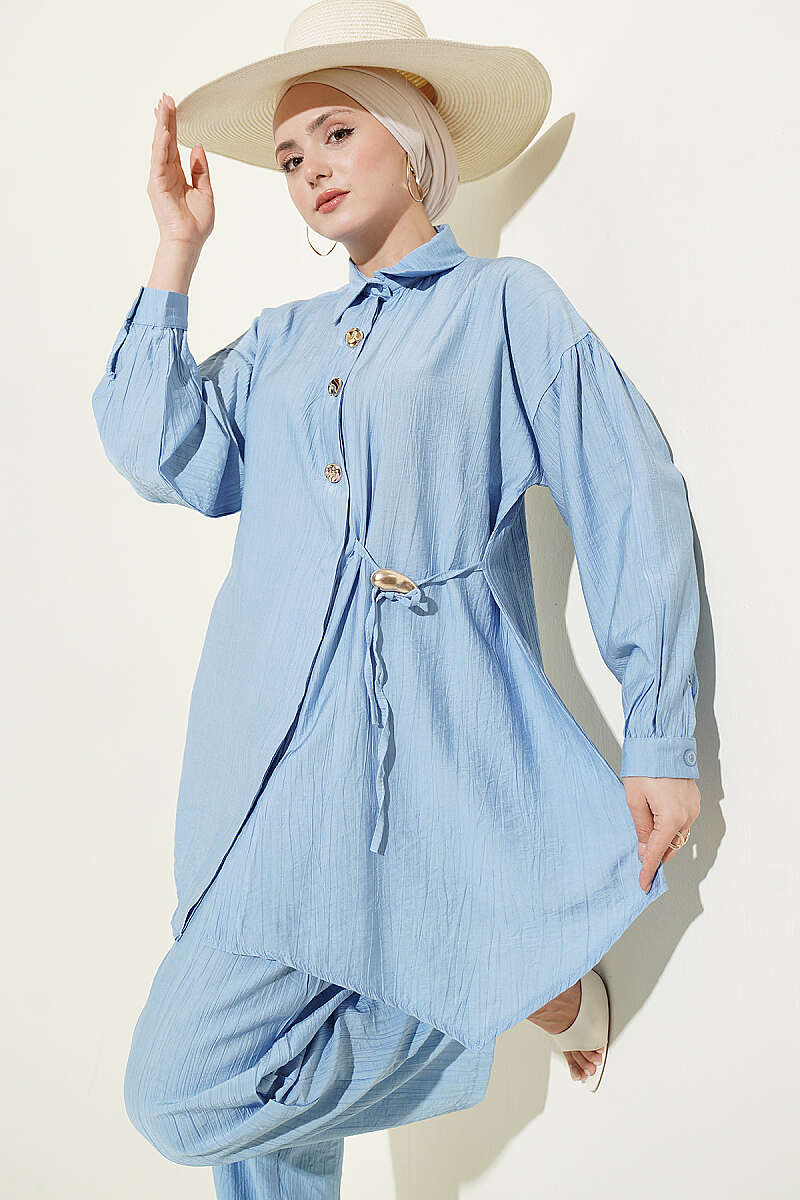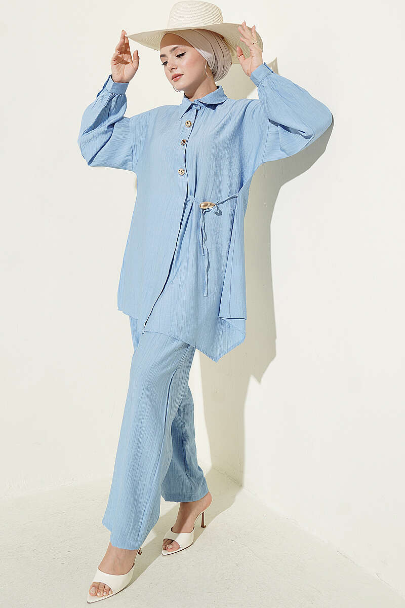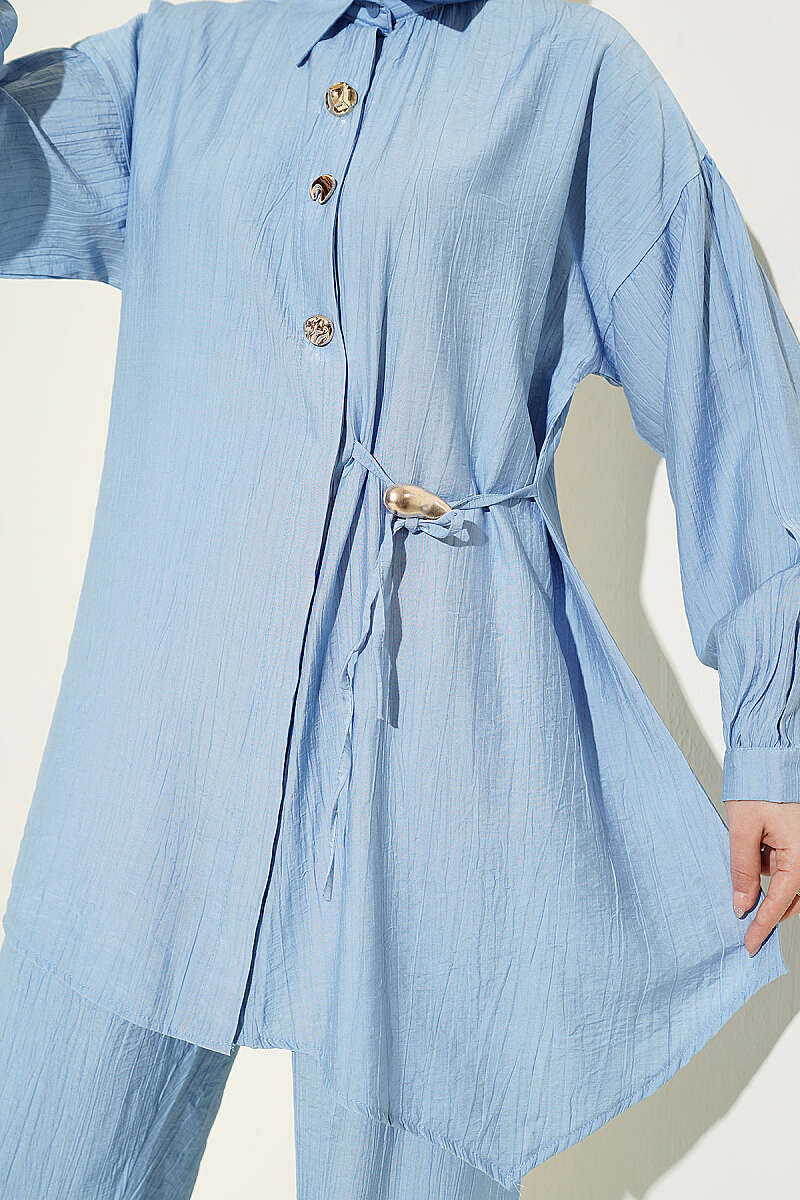 Gold Düğmeli Yan İp Bağcıklı İkili Takım Mavi