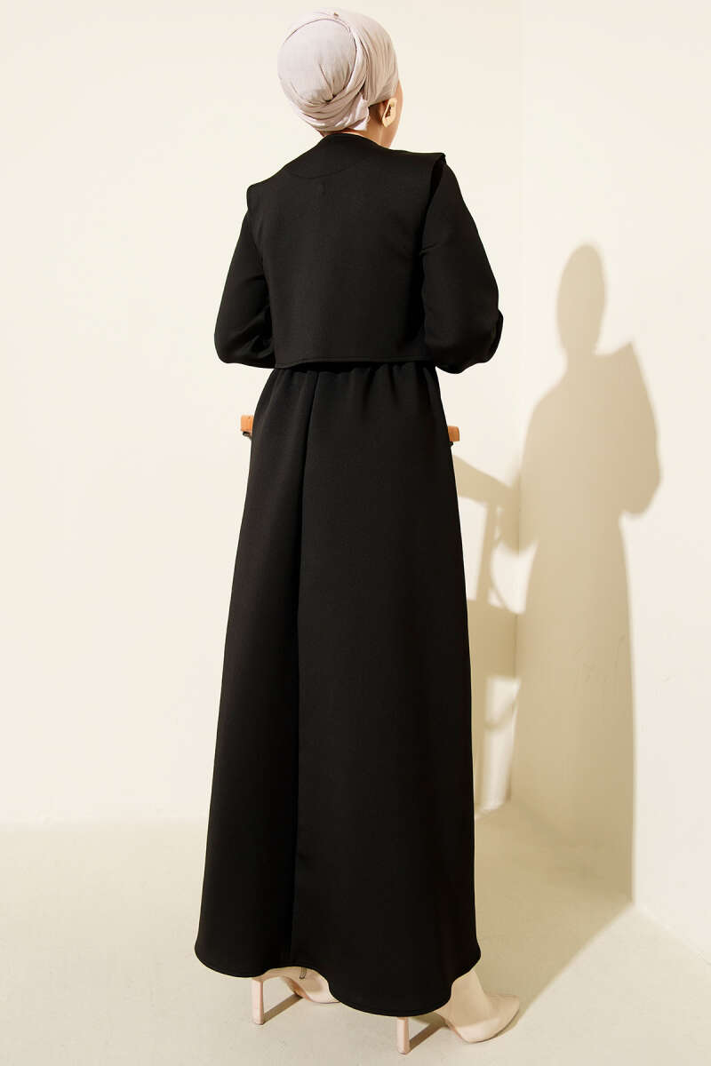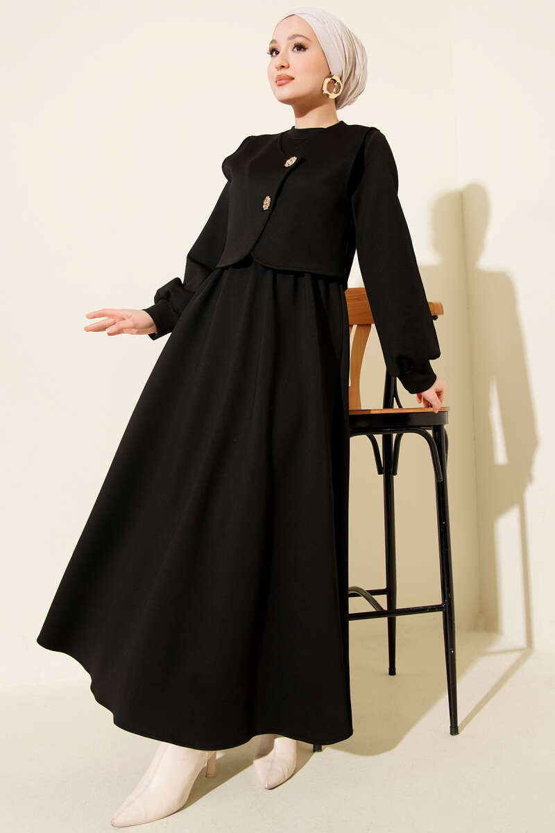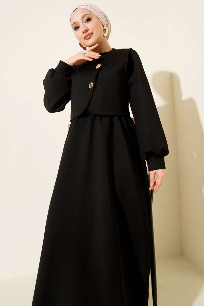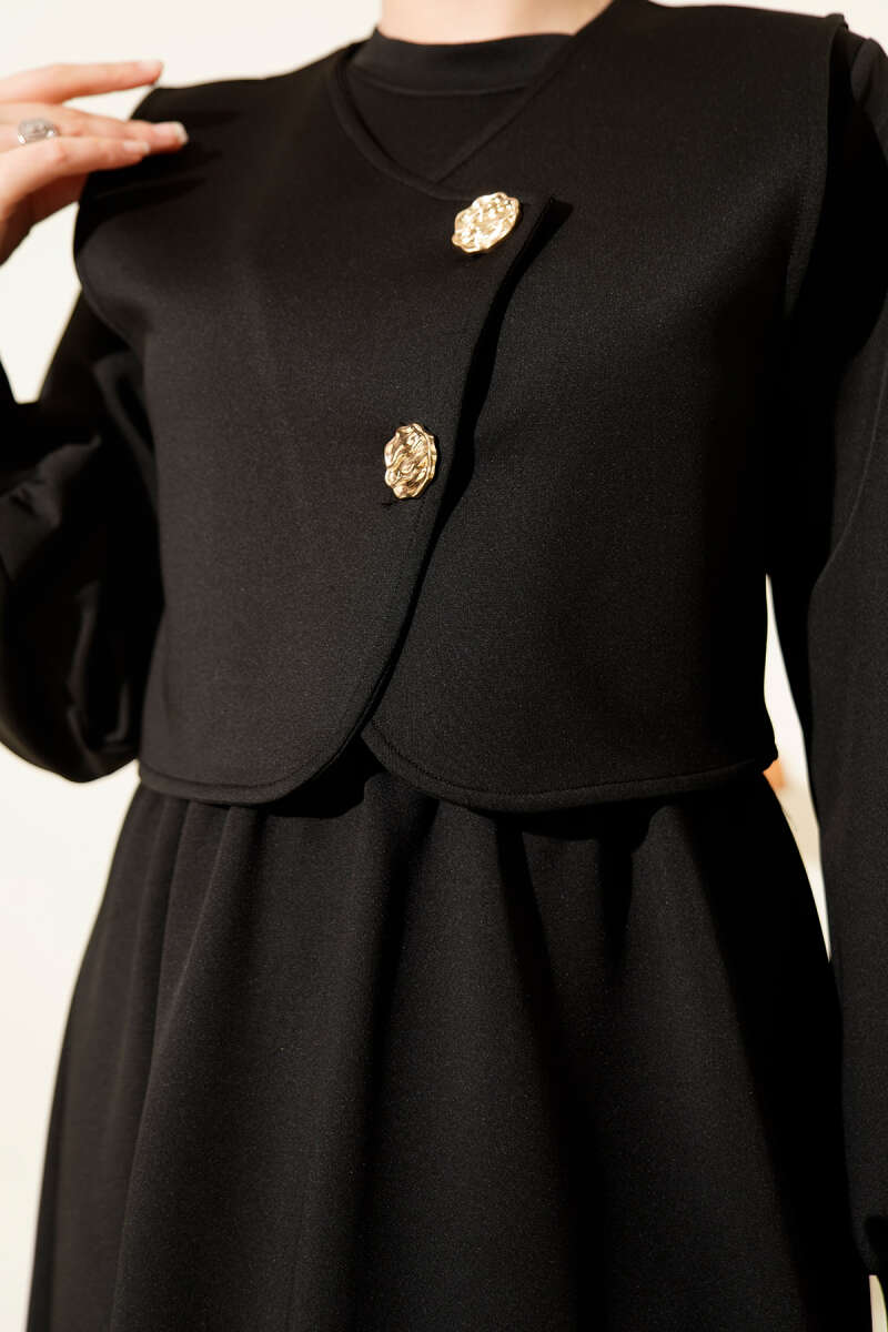 Gold Düğmeli Yelekli Elbise Takım Siyah