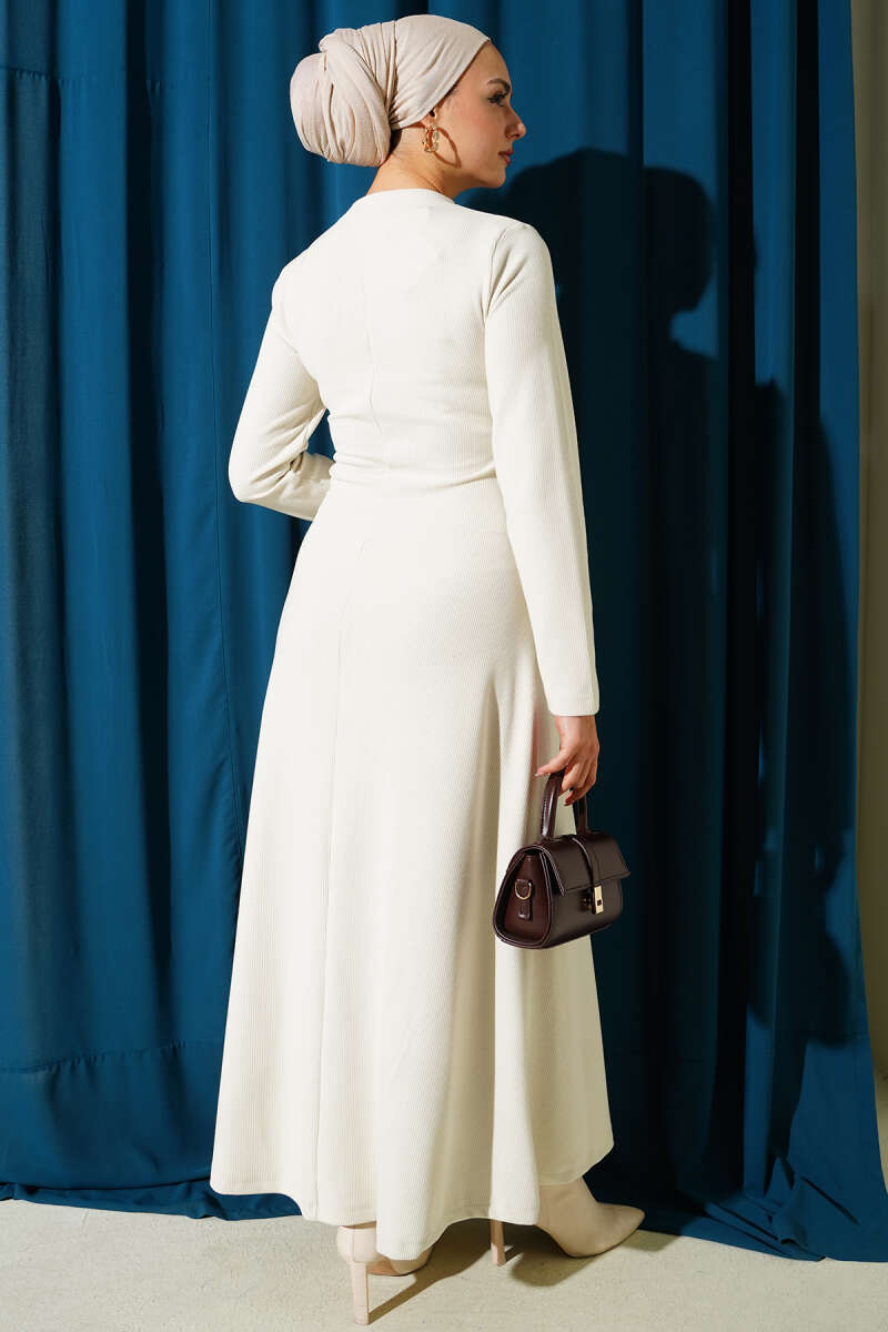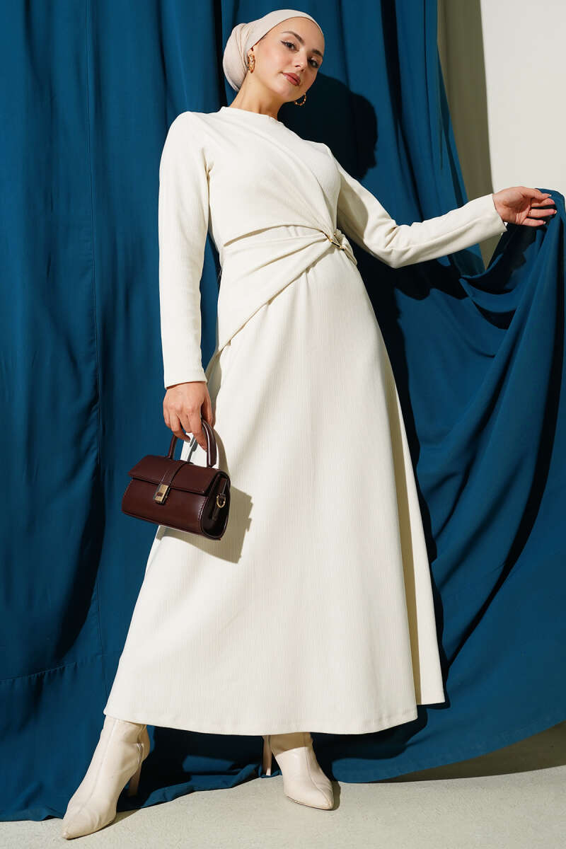 Gold Tokalı Fitilli Elbise Ekru