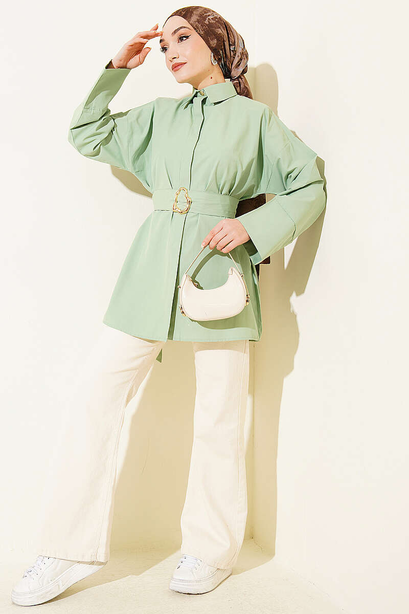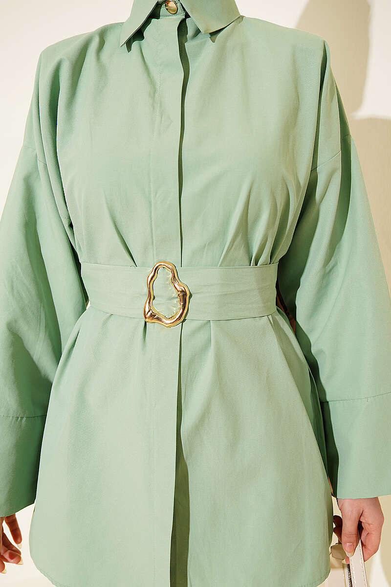Gold Tokalı Gizli Düğmeli Gömlek Çağla Yeşili