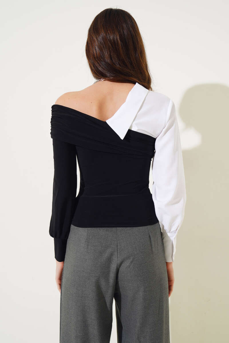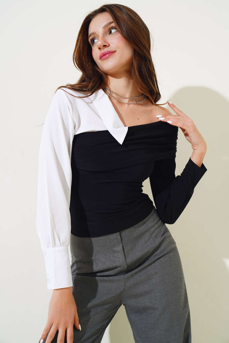 Yan Büzgülü Desenli Tül Bluz Siyah