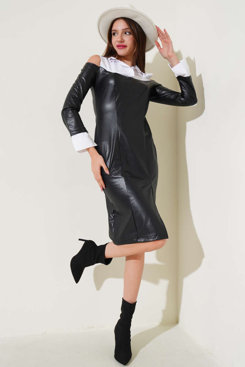 Gömlek Garnili Deri Elbise Siyah