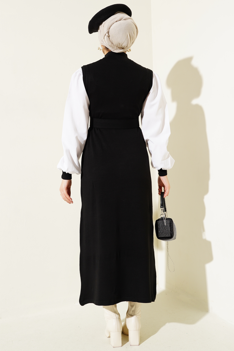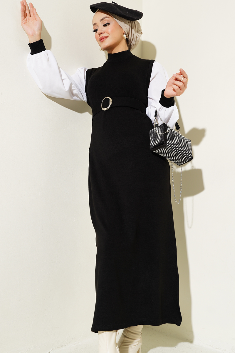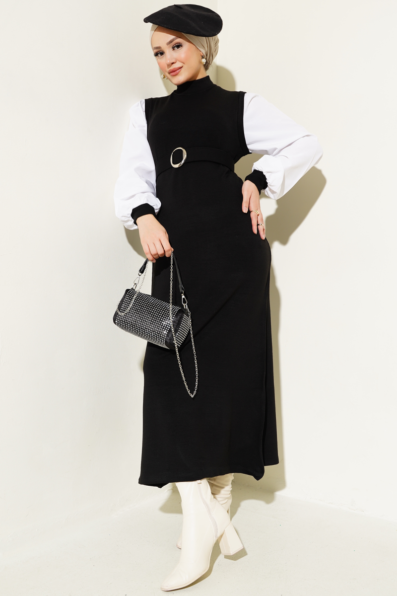 Kat Kat Kuşaklı Terikoton Elbise Siyah