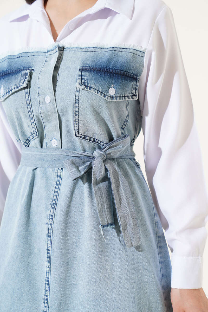 Yarım Yaka Fermuarlı Cepli Kot Elbise Lacivert