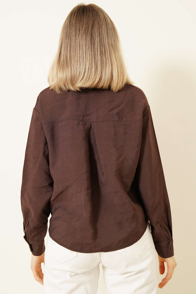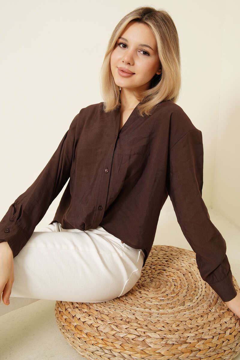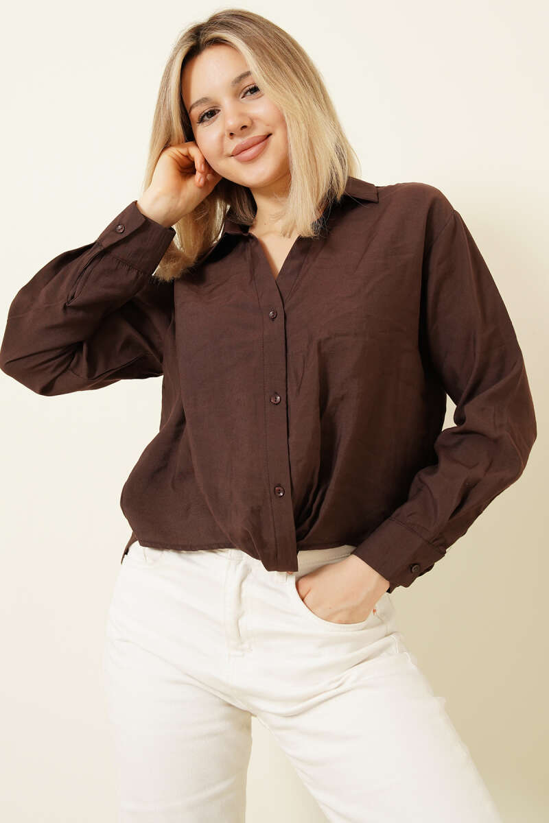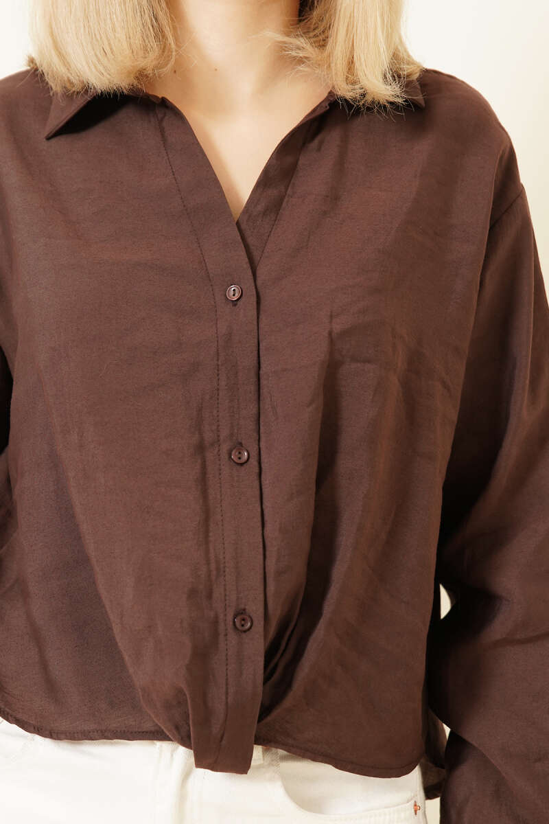 Çizgi Gömlek Garnili Kısa Sweatshirt Kahve