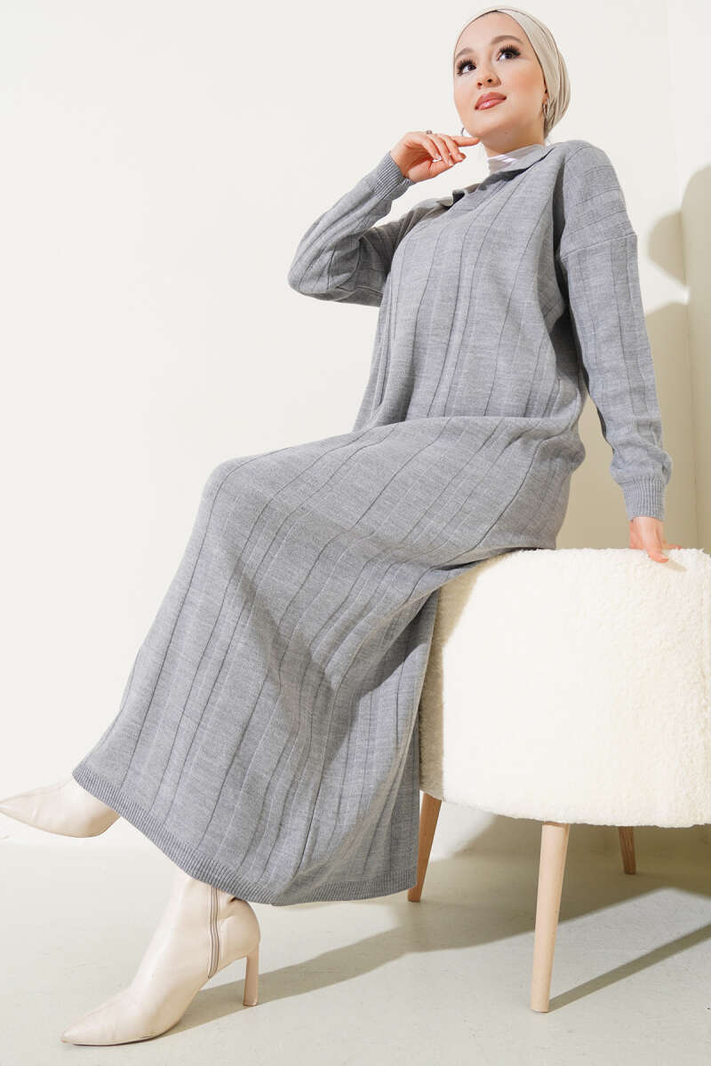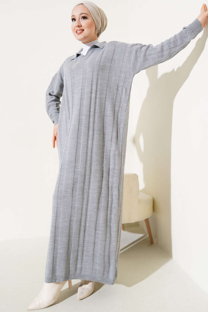 Gömlek Yaka Basic Triko Elbise Gri