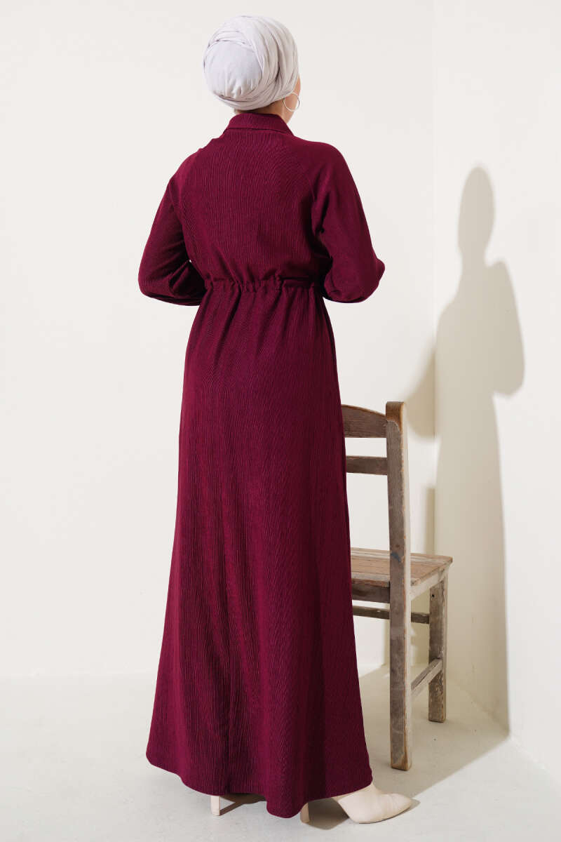 Gömlek Yaka Bel Tünelli Bürümcük Elbise Bordo