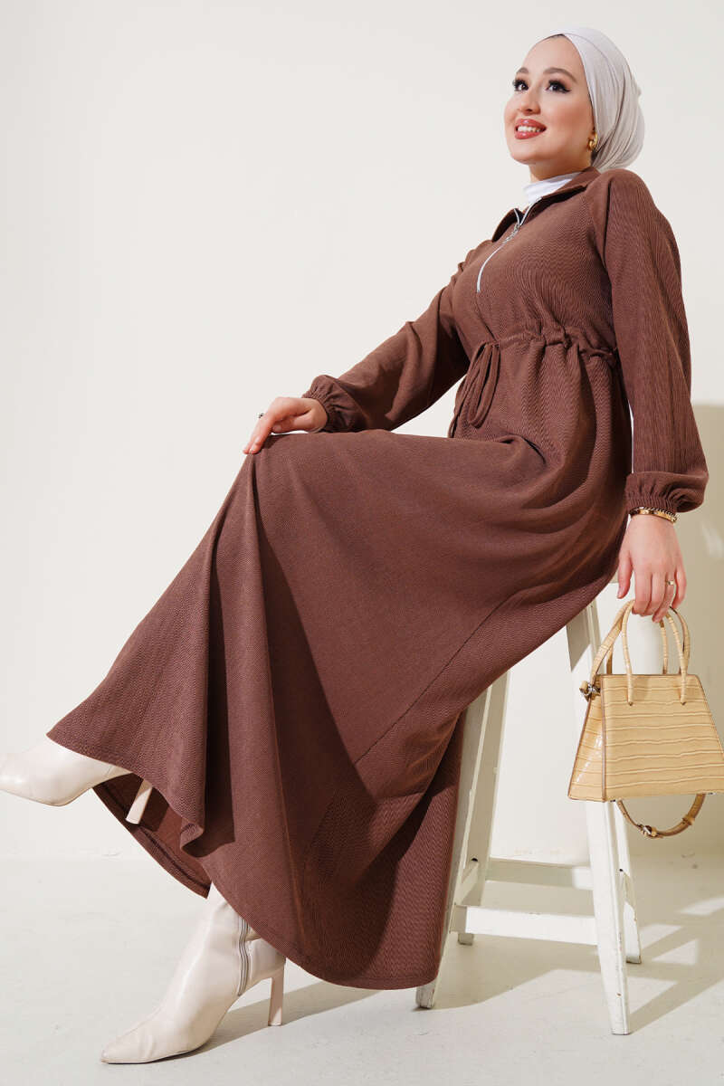 Kuşaklı Dik Fitilli Kaşe Elbise Kahve