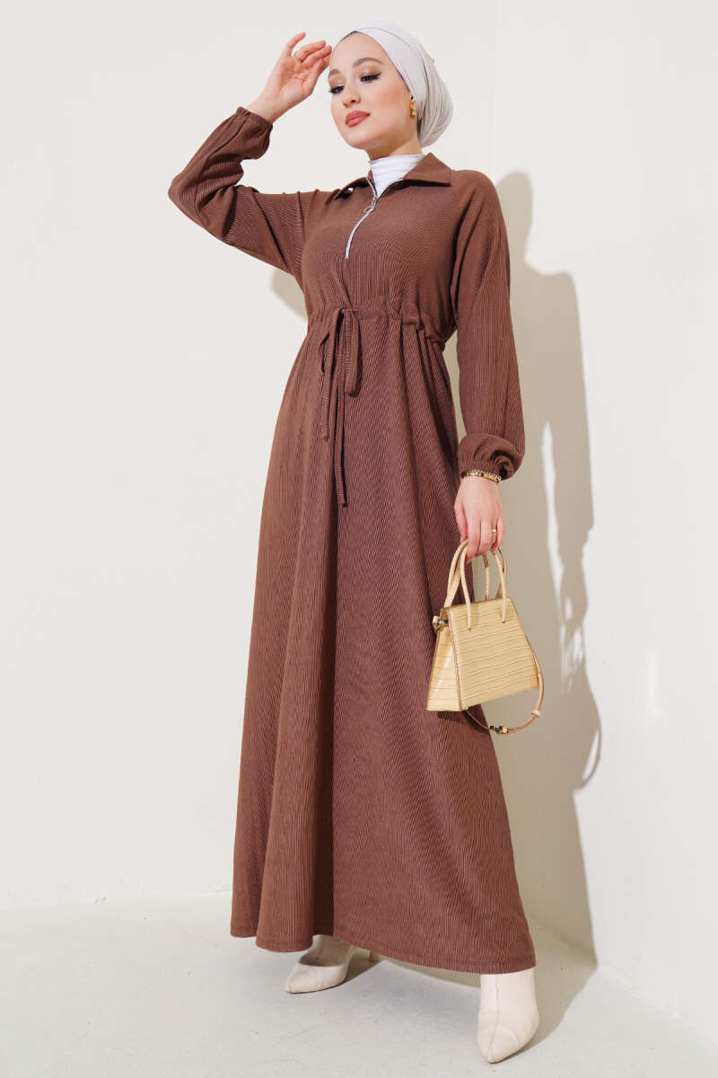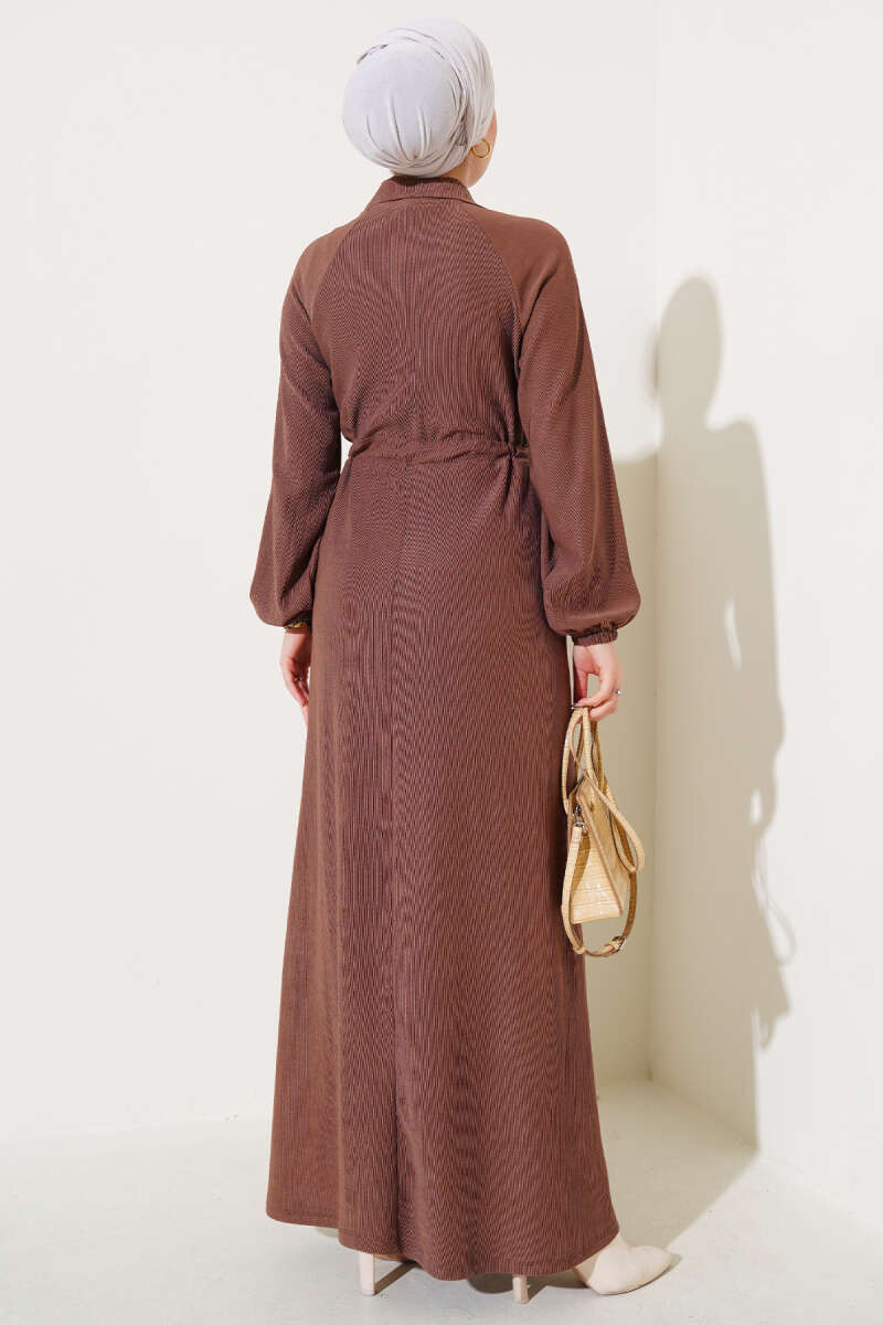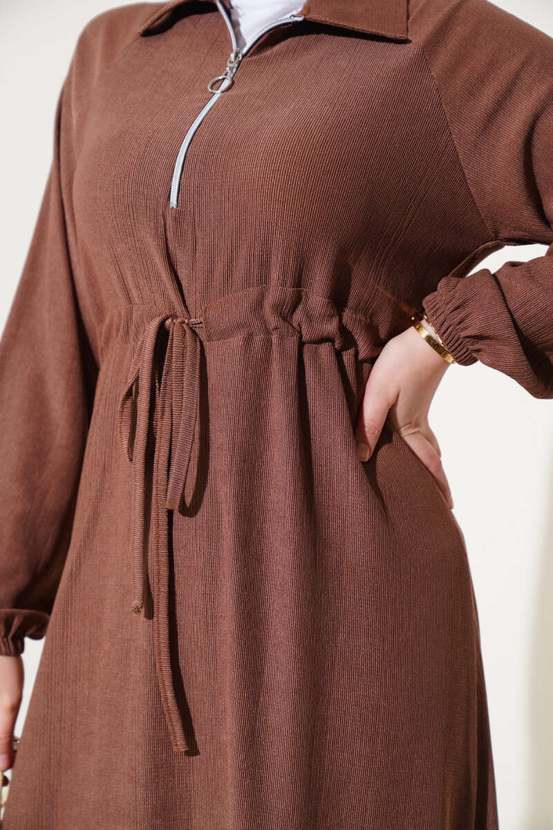 Gömlek Yaka Bel Tünelli Bürümcük Elbise Kahve