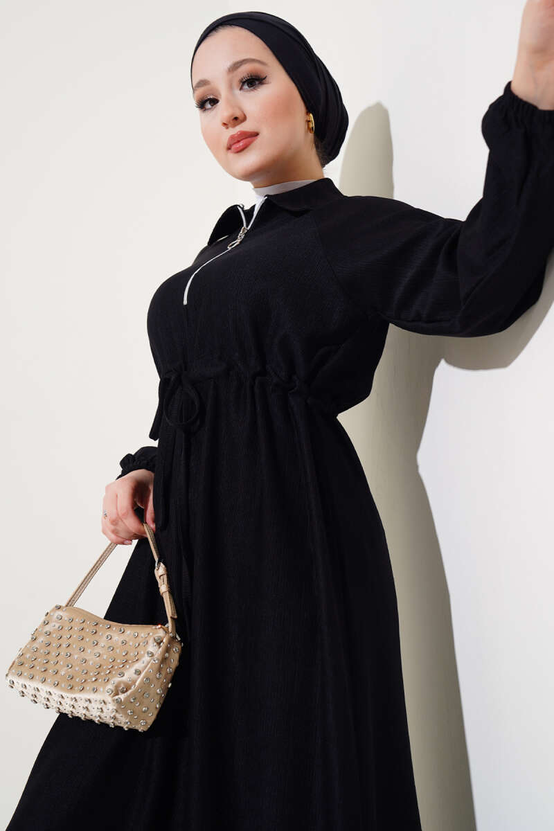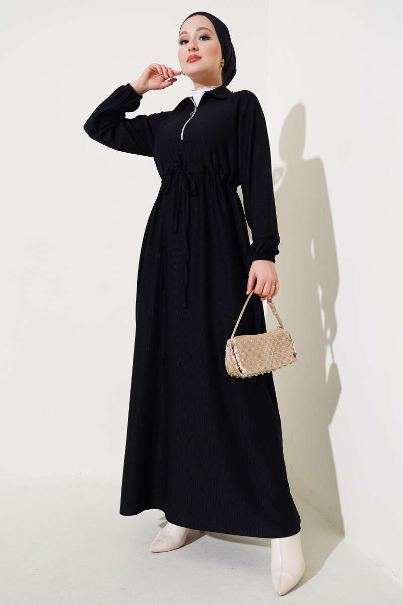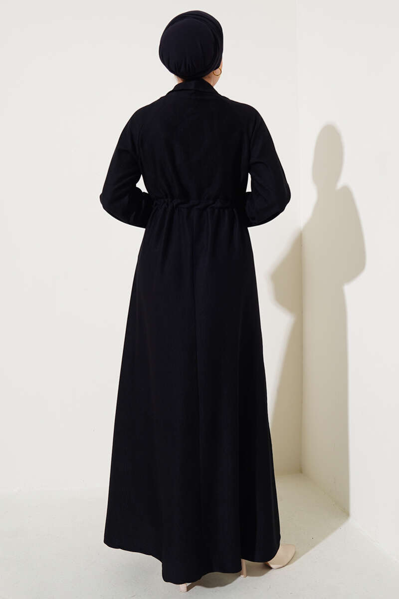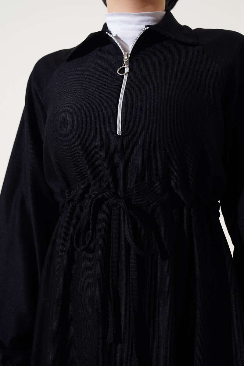 Gömlek Yaka Bel Tünelli Bürümcük Elbise Siyah