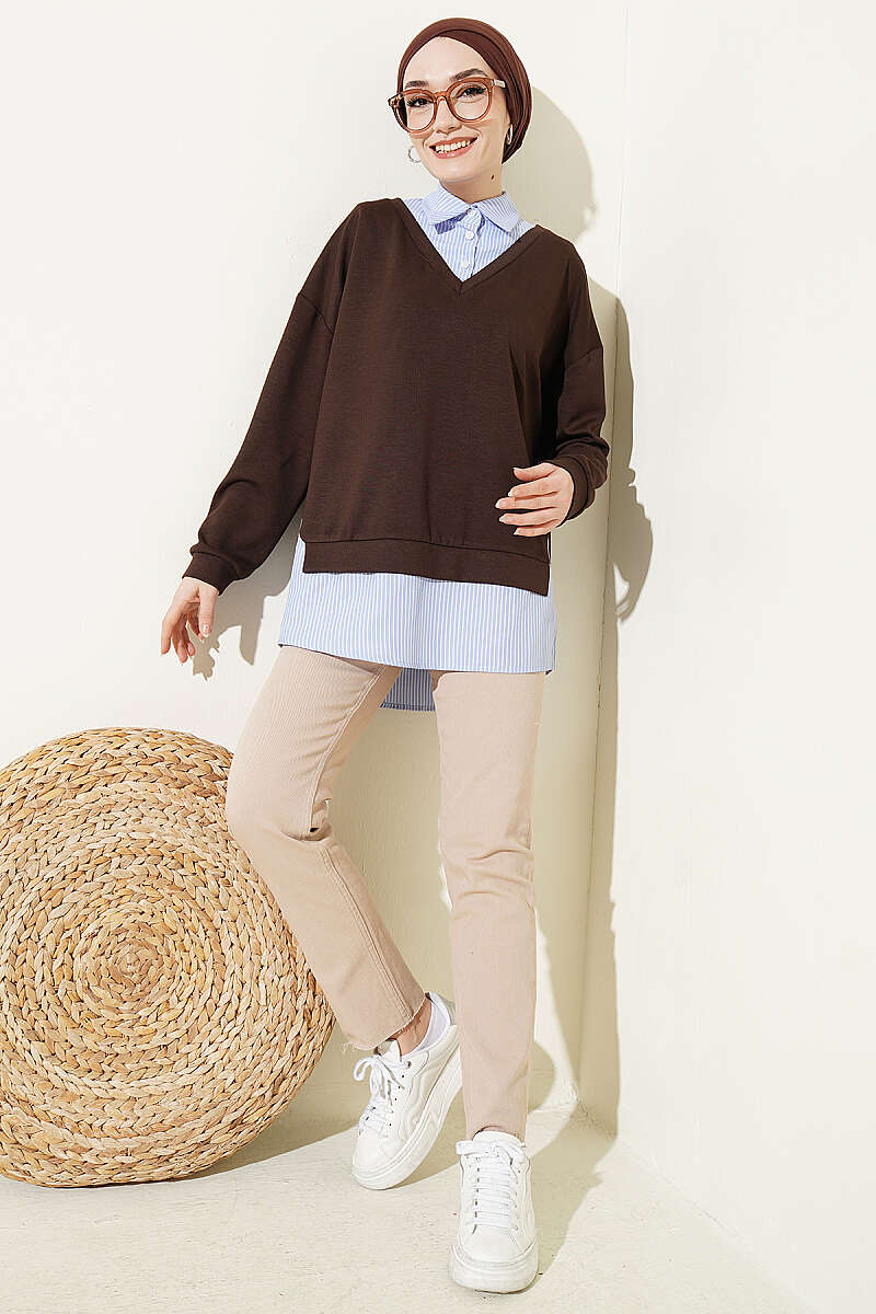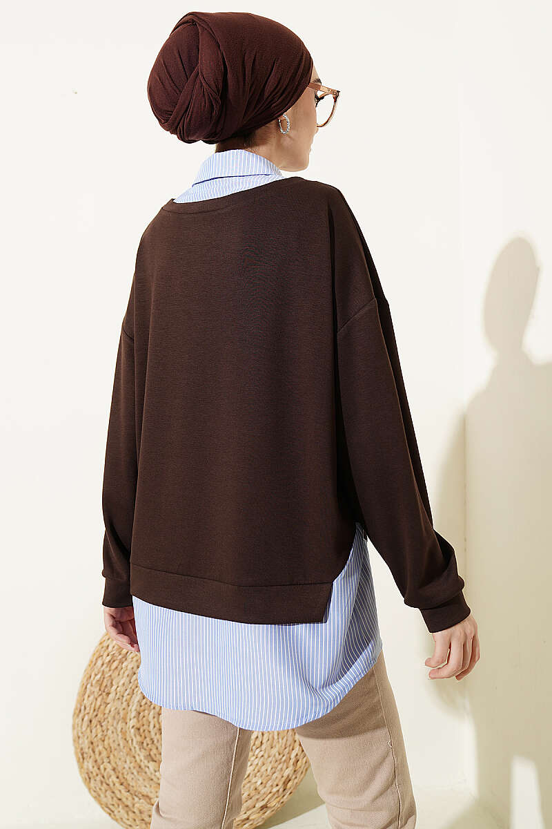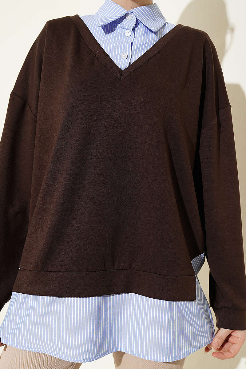 Gömlek Yaka Çizgi Garnili Loyşa Tunik Kahve