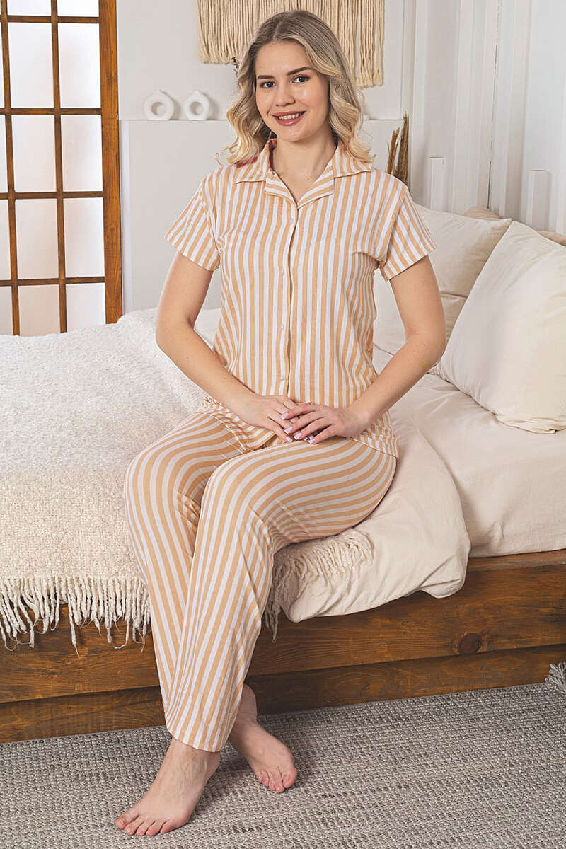 Gömlek Yaka Çizgili Pijama Takımı Somon