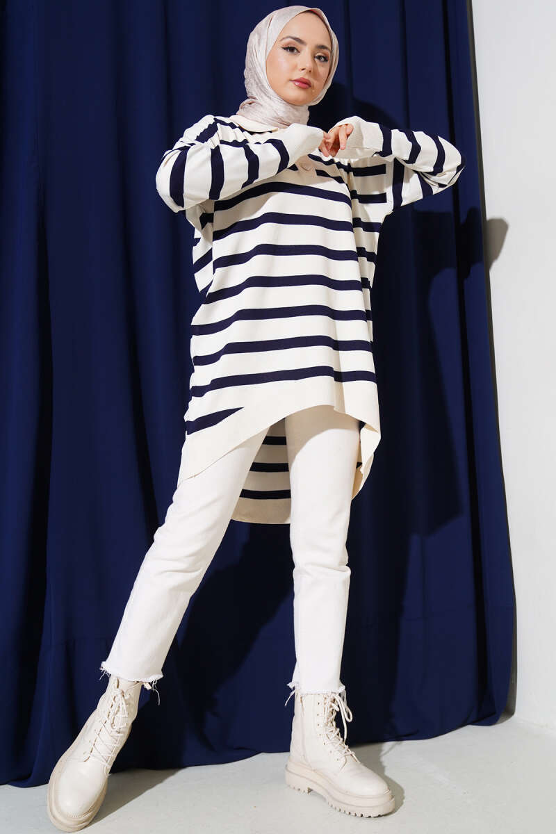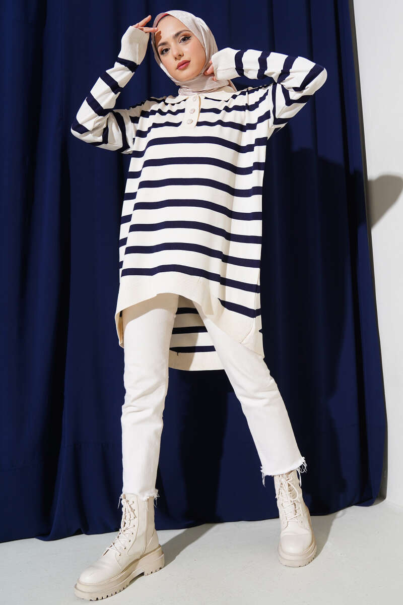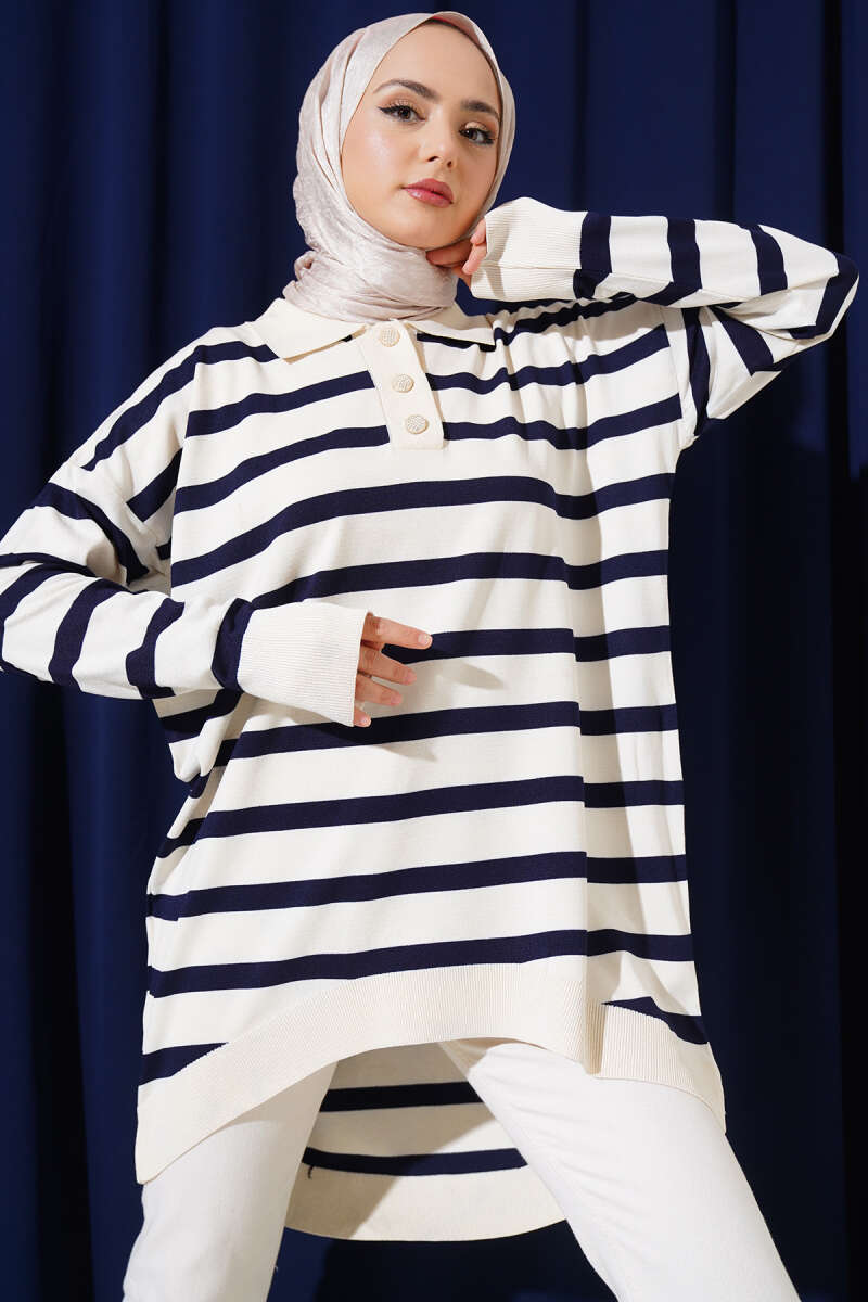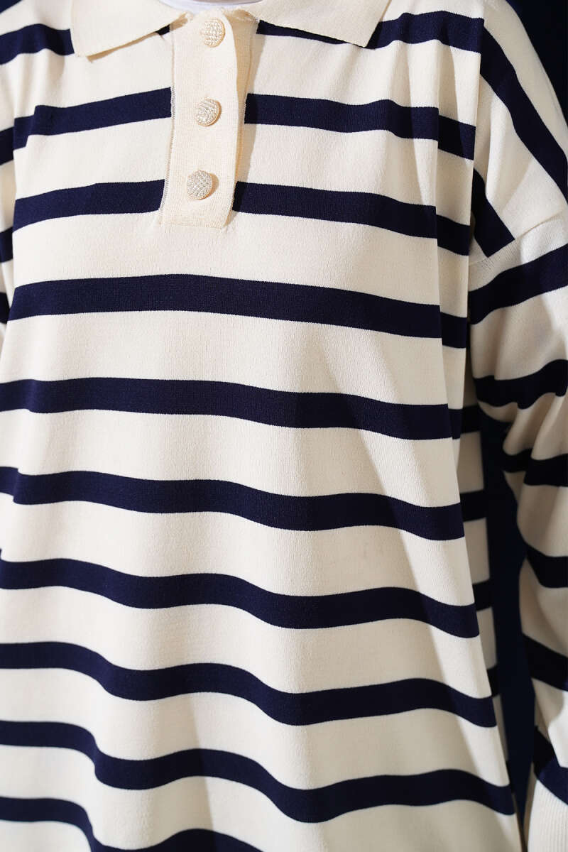 Gömlek Yaka Çizgili Salaş Triko Tunik Vanilya
