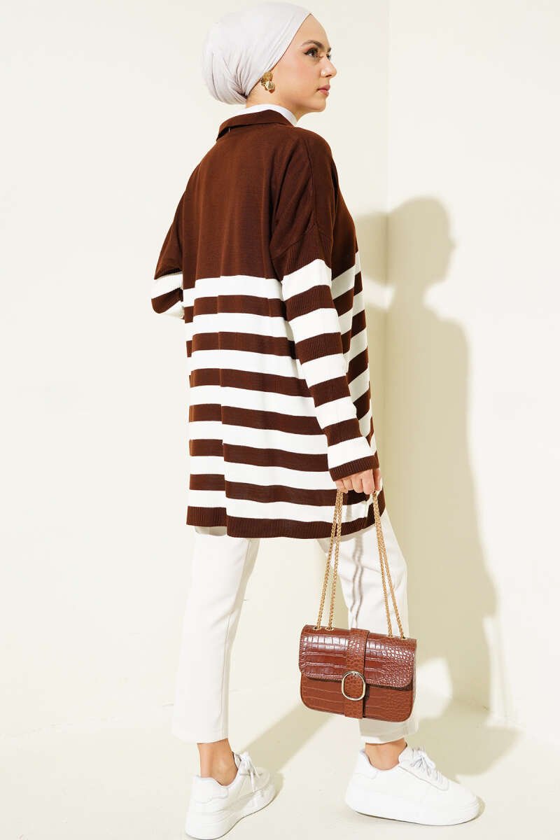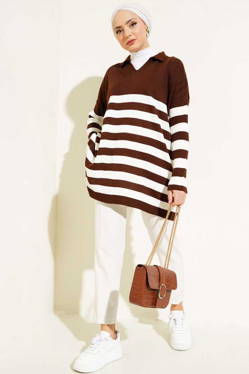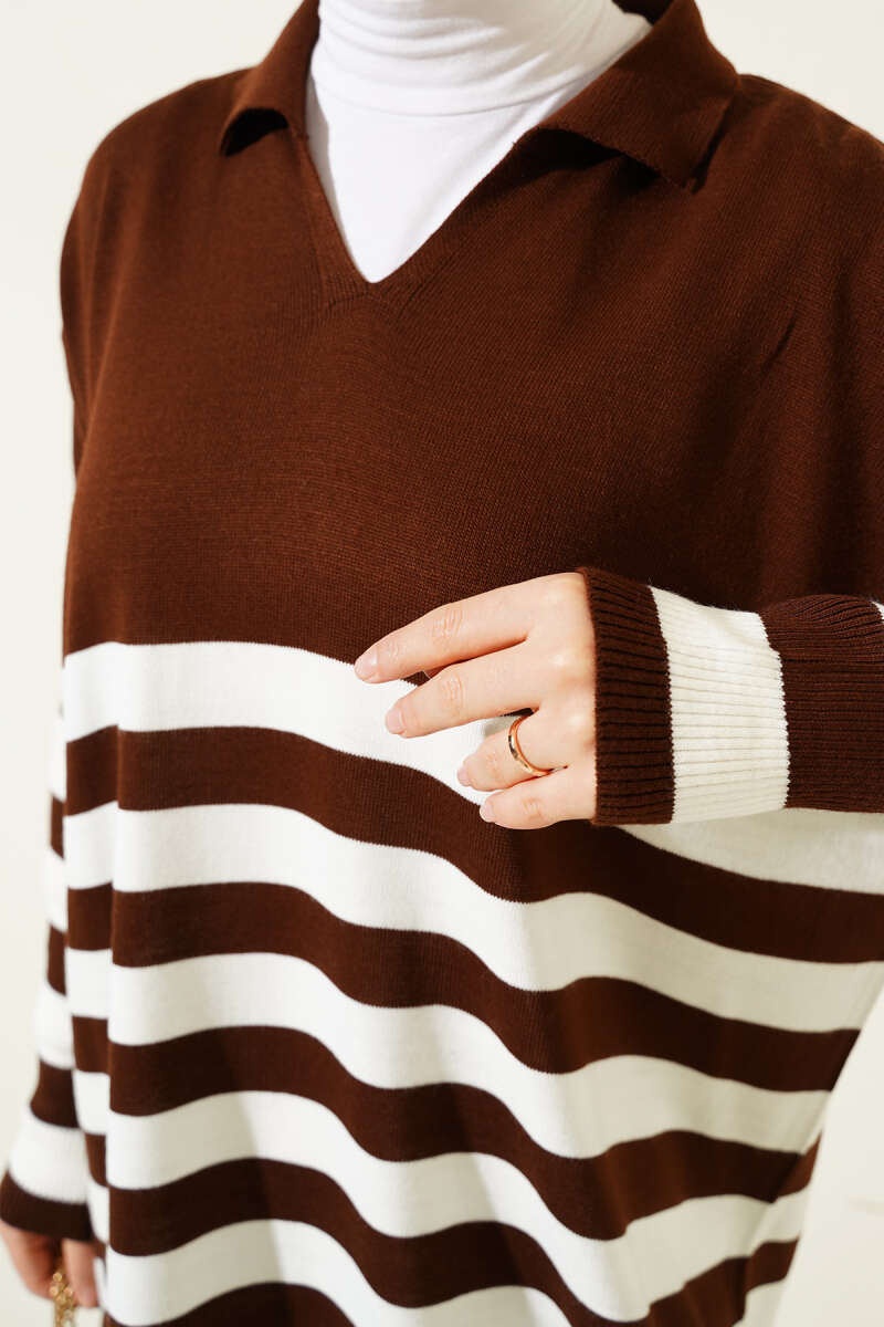 Gömlek Yaka Çizgili Triko Tunik Bej