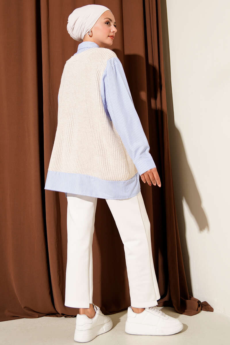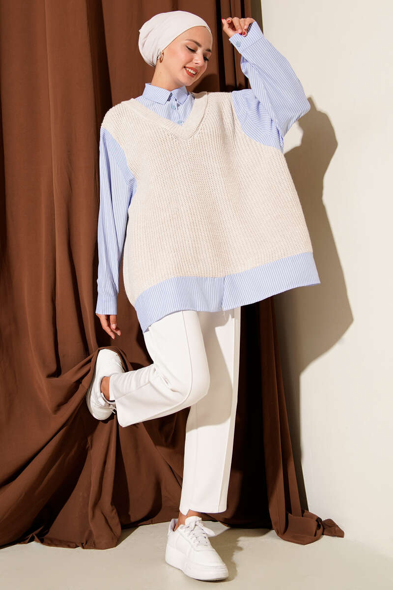 Çizgili Balıkçı Yaka Detaylı Triko Kazak Mavi