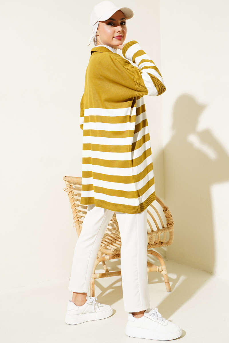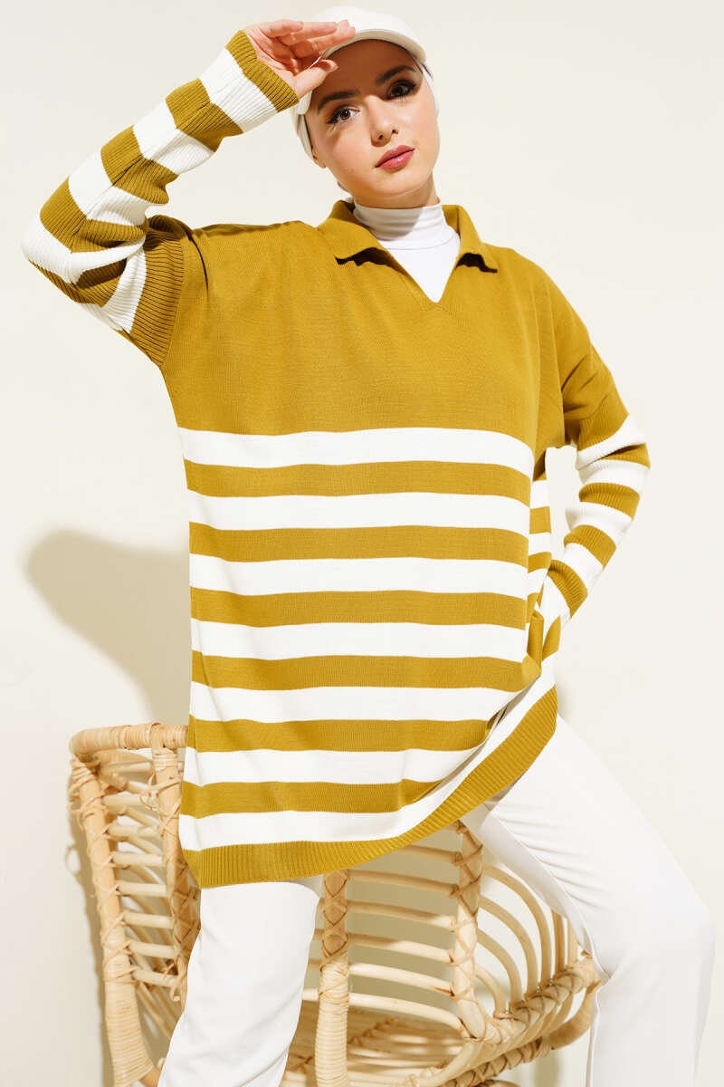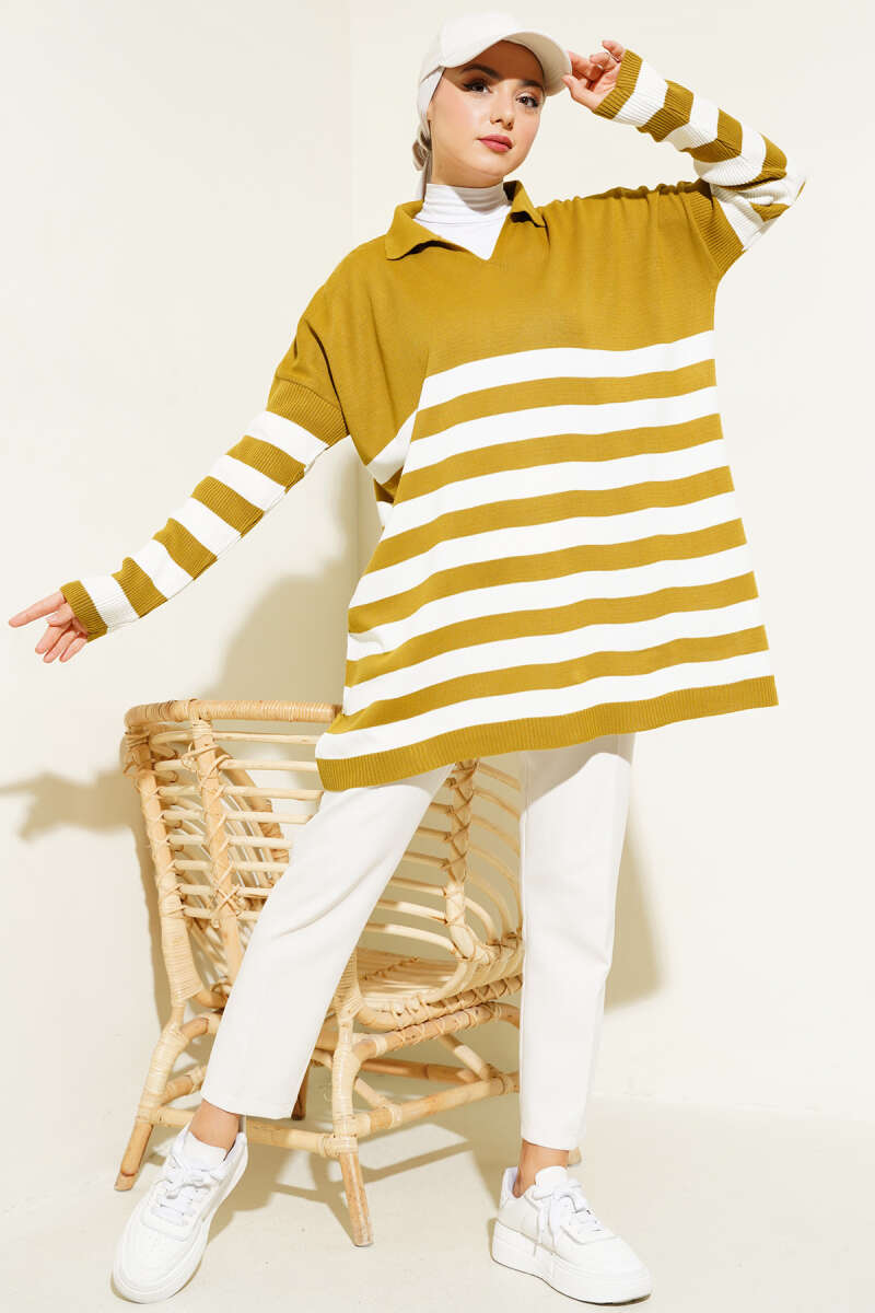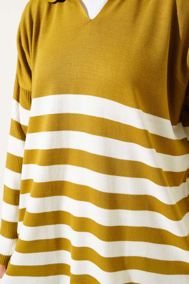 Gömlek Yaka Çizgili Triko Tunik Bej