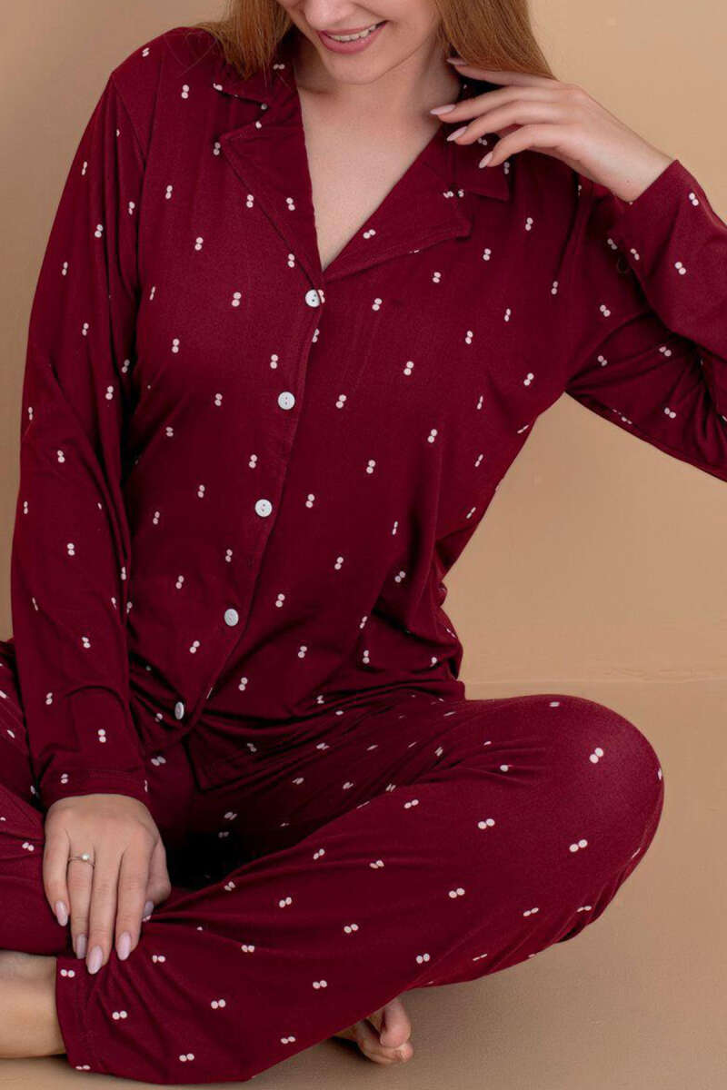 Gömlek Yaka Damla Desen Pijama Takımı Bordo