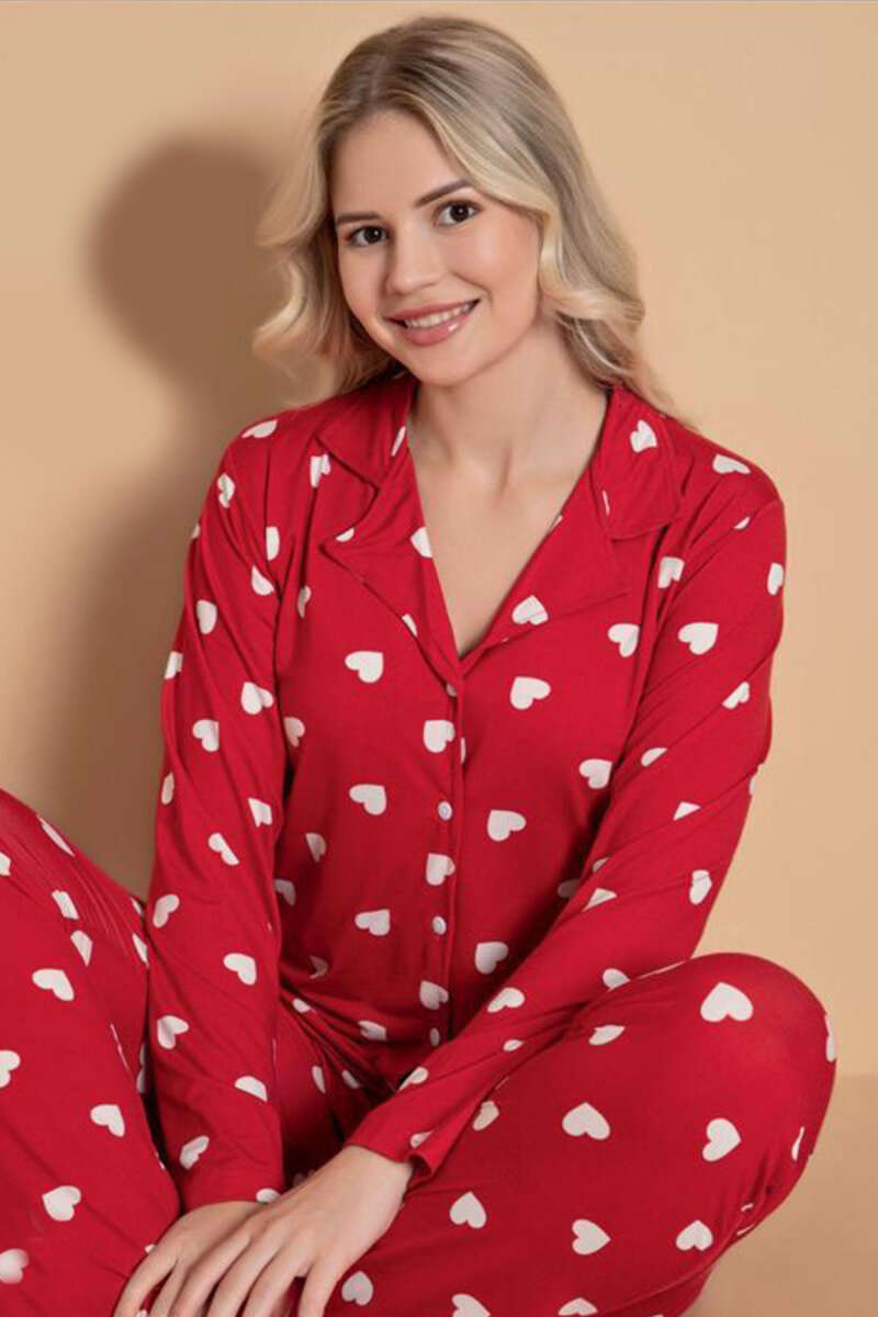 Gömlek Yaka Damla Desen Pijama Takımı Kırmızı Beyaz