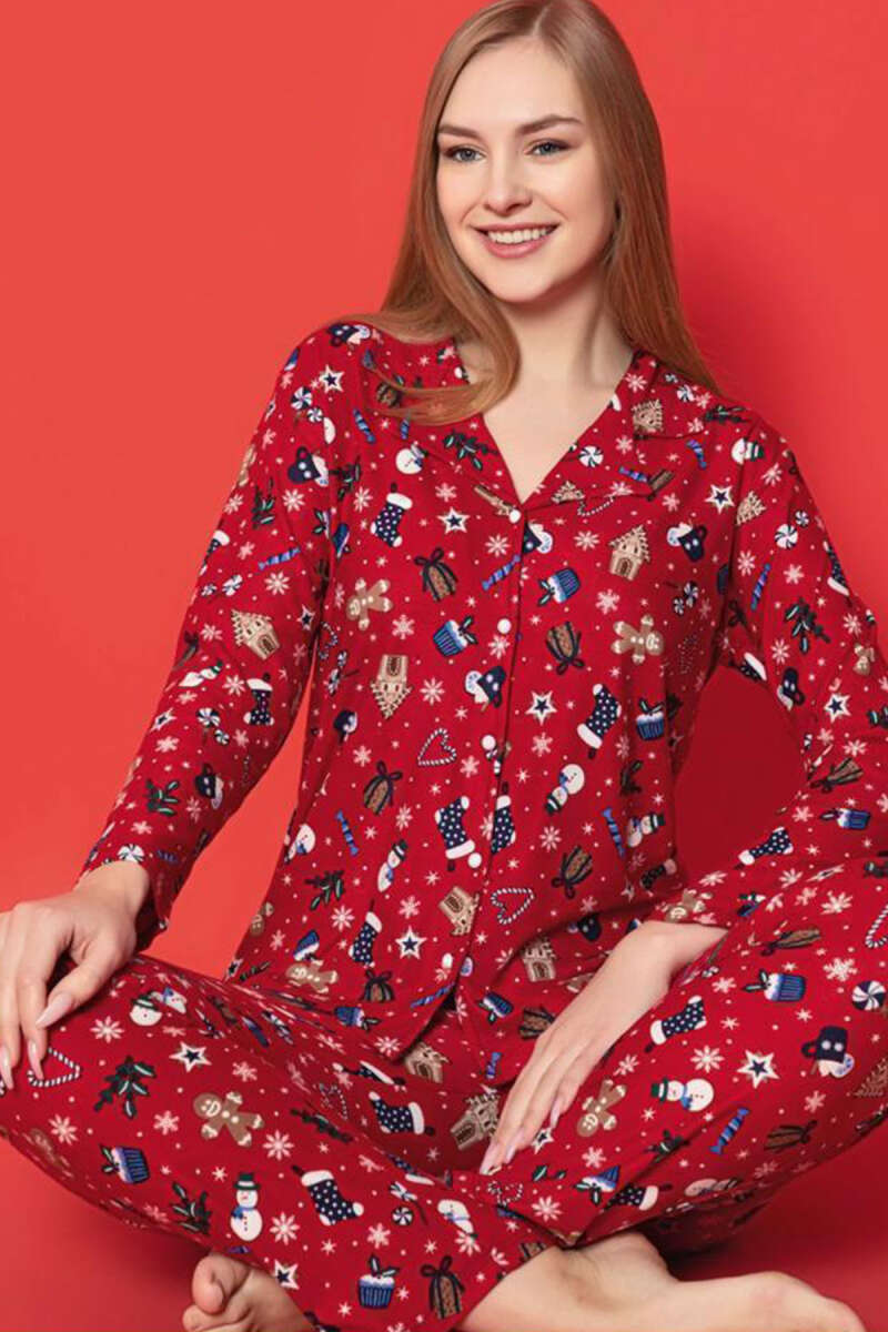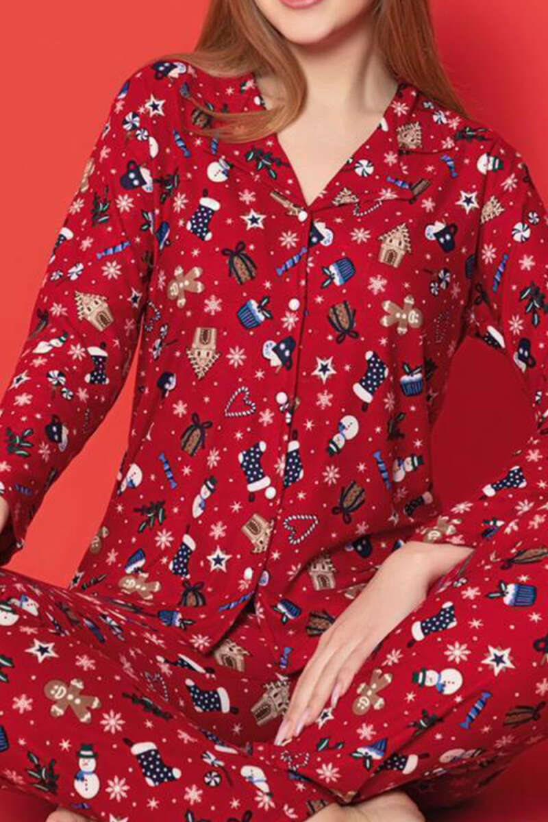 Gömlek Yaka Desenli Süet Pijama Takımı Kırmızı