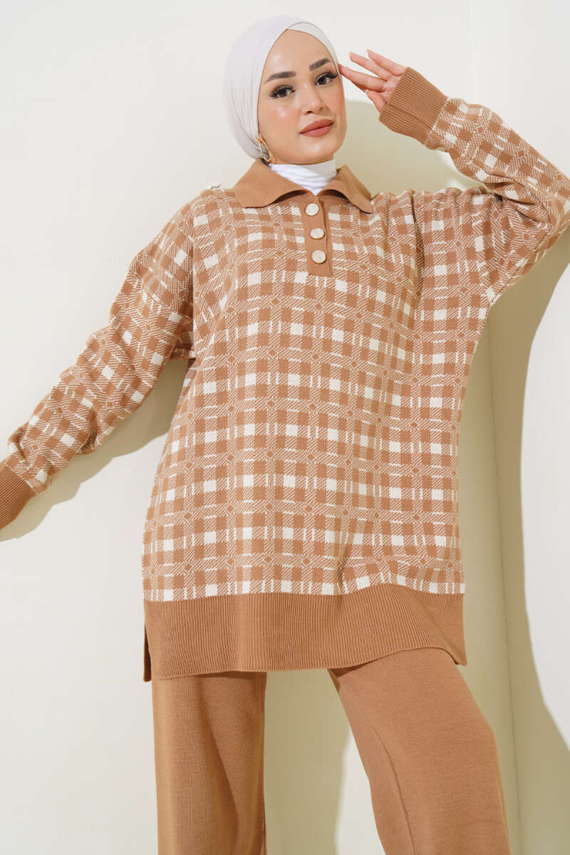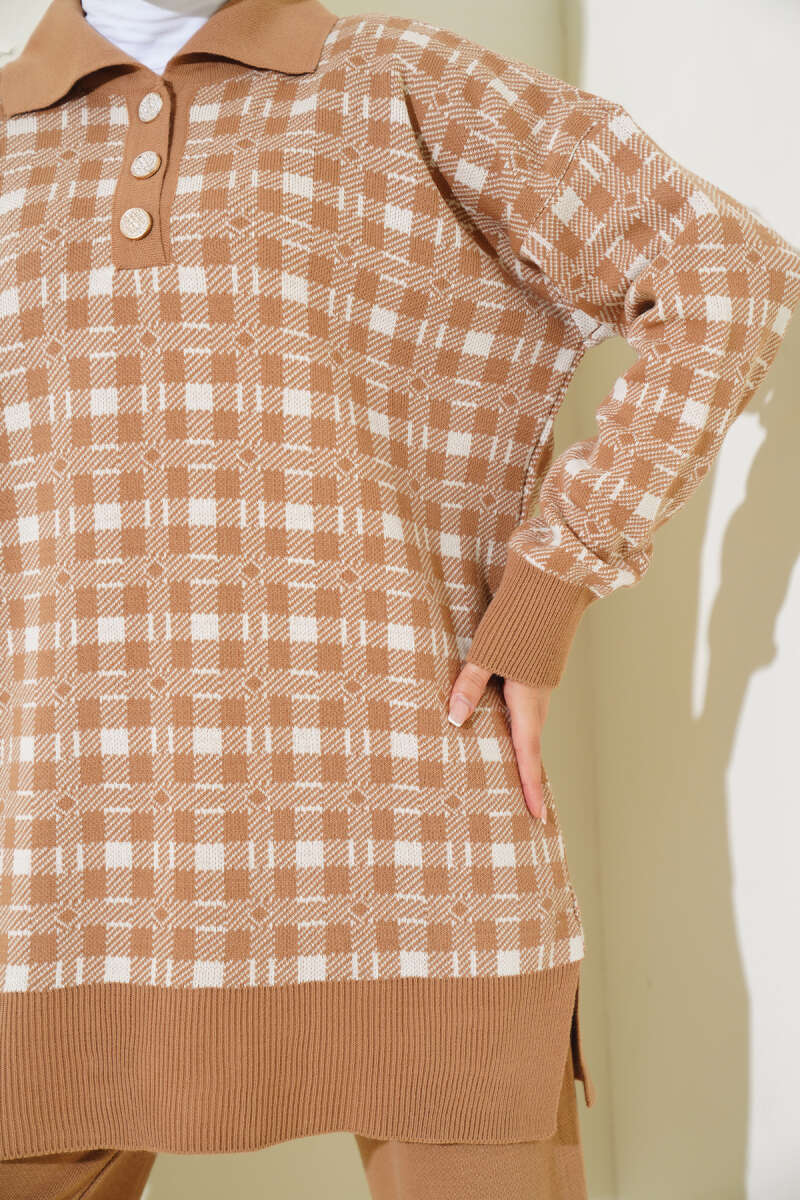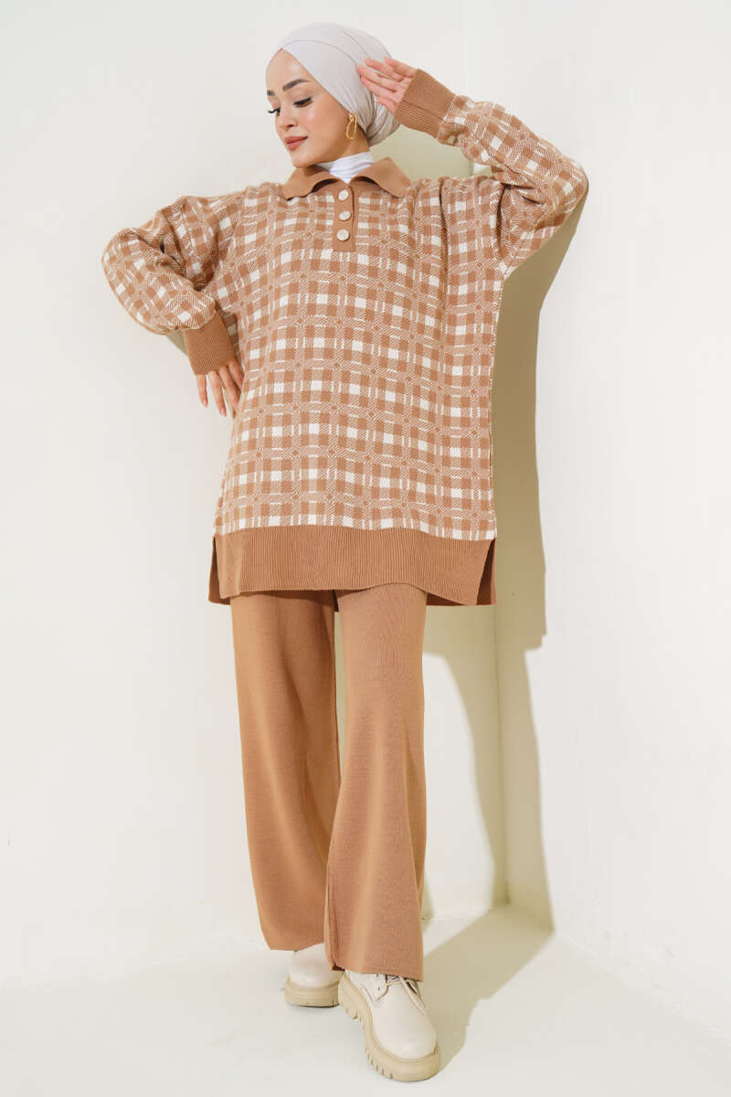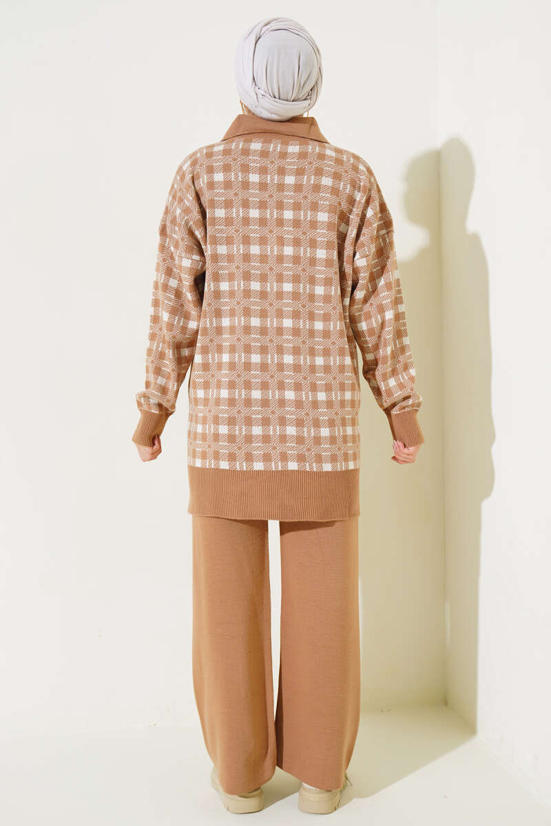Taşlı Baklava Desen Triko İkili Takım Kahve