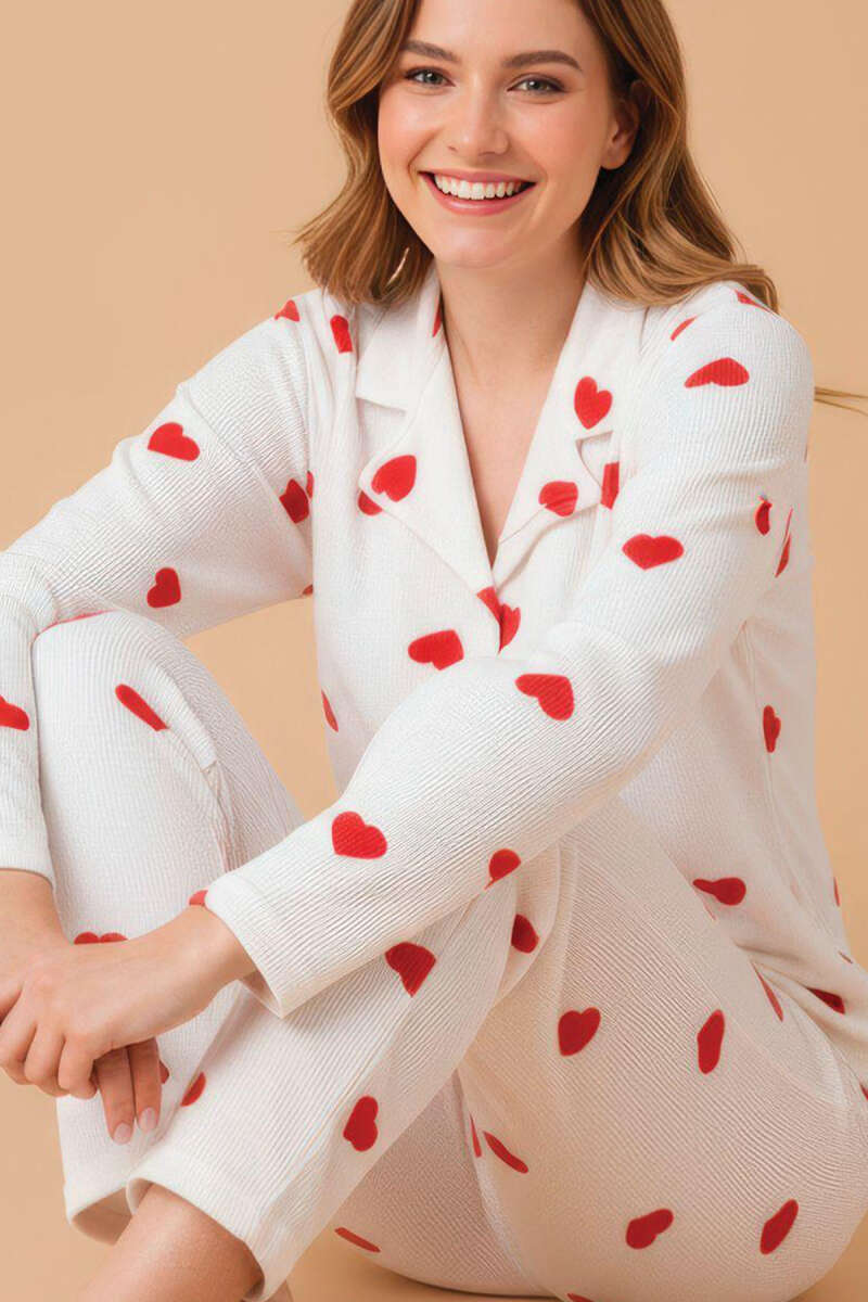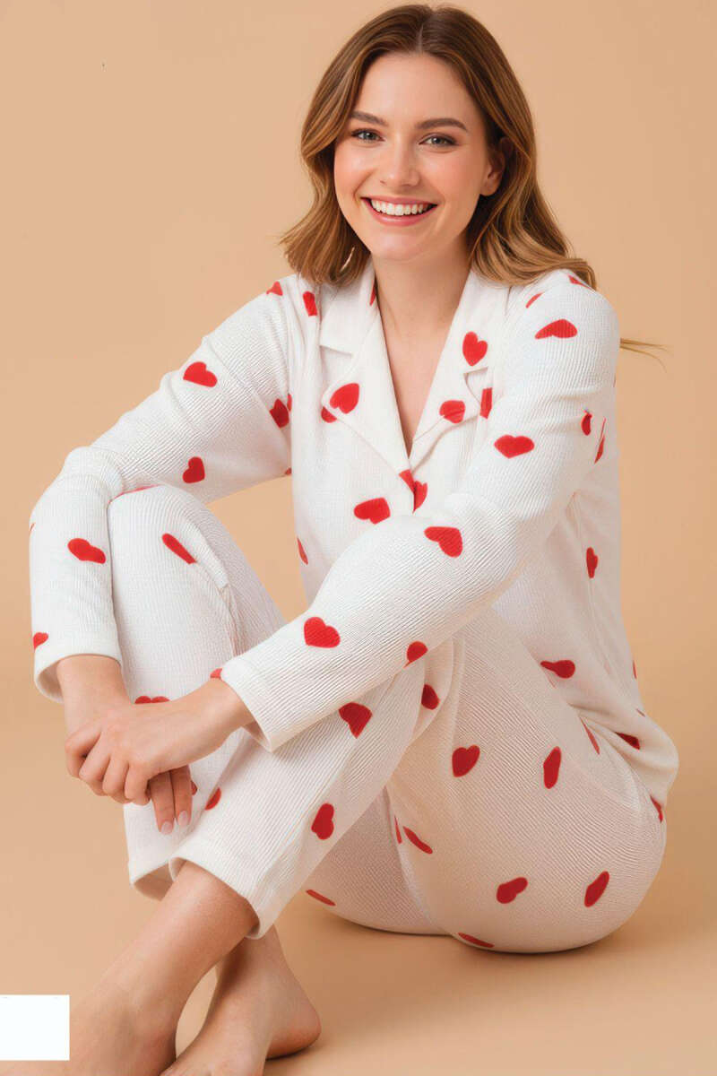Gömlek Yaka Desenli Waffle Pijama Takımı Beyaz