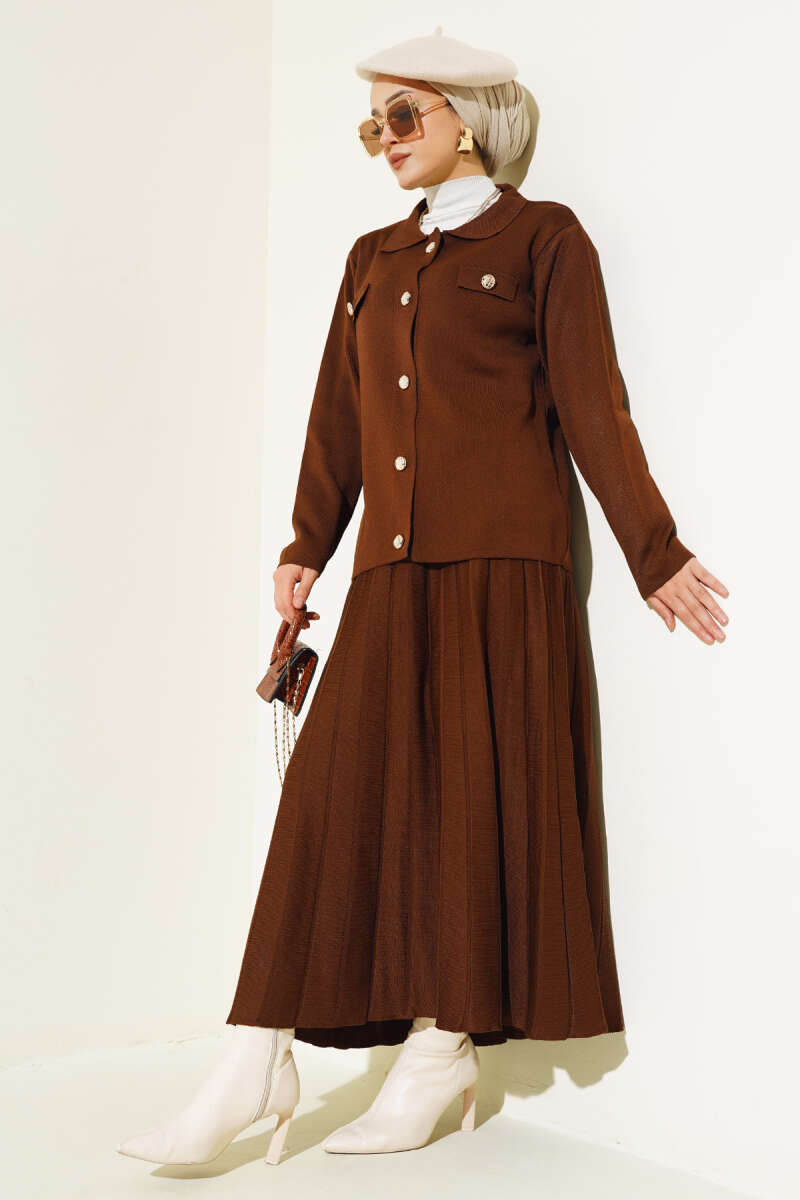 Gömlek Yaka Düğmeli Etekli Triko Takım Kahve